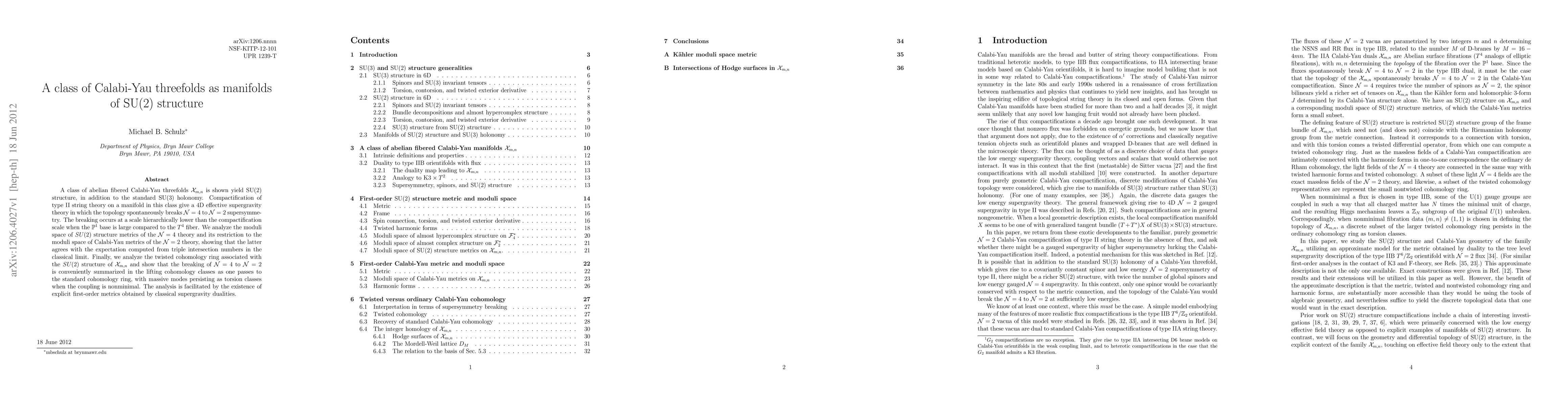 A class of abelian fibered Calabi-Yau threefolds X_{m,n} is shown yield SU(2) structure, in addition to the standard SU(3) holonomy. Compactification of type II string theory on a manifold in this class give a 4D effective supergravity theory in which the topology spontaneously breaks N=4 to N=2 supersymmetry. The breaking occurs at a scale hierarchically lower than the compactification scale when the P^1 base is large compared to the T^4 fiber. We analyze the moduli space of SU(2) structure metrics of the N=4 theory and its restriction to the moduli space of Calabi-Yau metrics of the N=2 theory, showing that the latter agrees with the expectation computed from triple intersection numbers in the classical limit. Finally, we analyze the twisted cohomology ring associated with the SU(2) structure of X_{m,n} and show that the breaking of N=4 to N=2 is conveniently summarized in the lifting cohomology classes as one passes to the standard cohomology ring, with massive modes persisting as torsion classes when the coupling is nonminimal. The analysis is facilitated by the existence of explicit first-order metrics obtained by classical supergravity dualities.