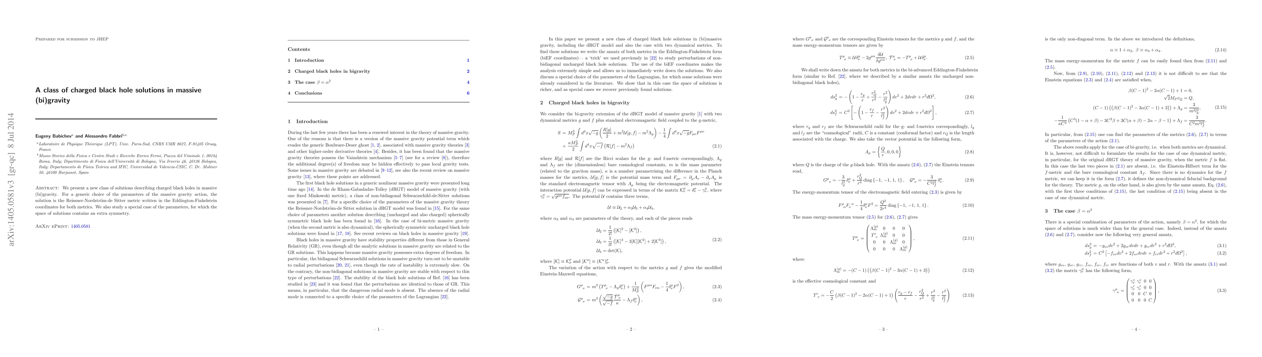This paper introduces a new class of charged black hole solutions in massive (bi)gravity, specifically the Reissner-Nordstrom-de Sitter metric in Eddington-Finkelstein coordinates, and explores an additional symmetry in a special parameter case.