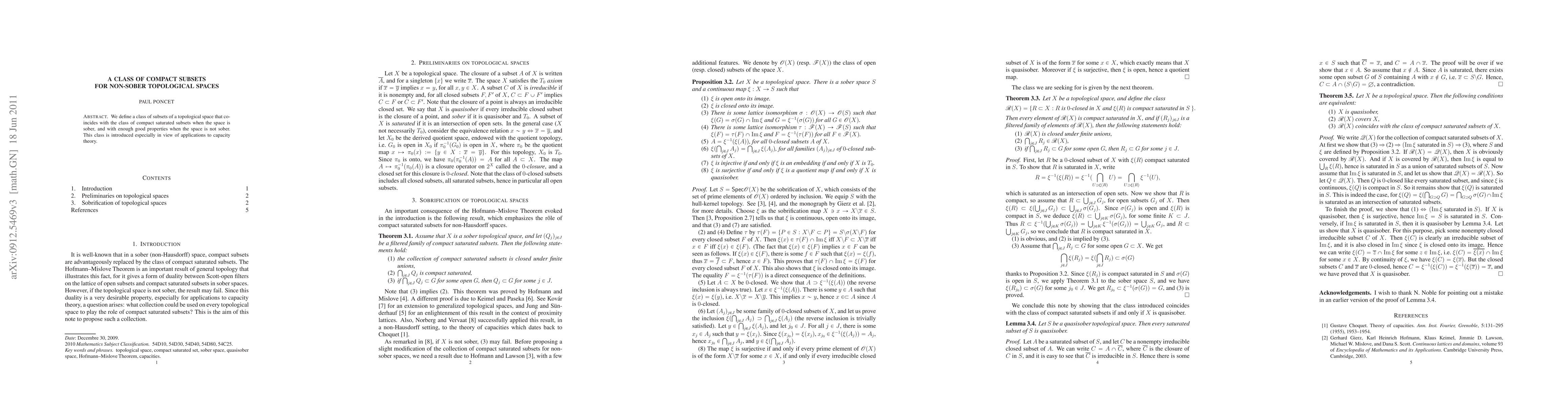 Researchers introduce a new class of compact subsets in topological spaces that can be used to improve capacity theory, with special consideration for non-sober spaces.