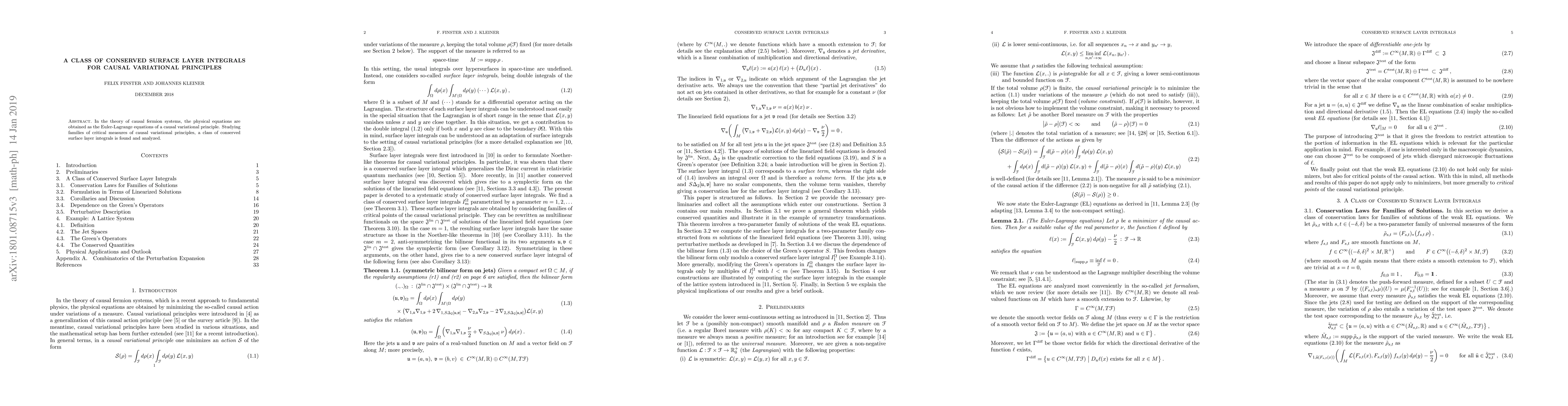This paper identifies and analyzes a class of conserved surface layer integrals derived from the Euler-Lagrange equations of causal variational principles in the theory of causal fermion systems. These integrals provide insights into the underlying dynamics and symmetries of the physical equations.