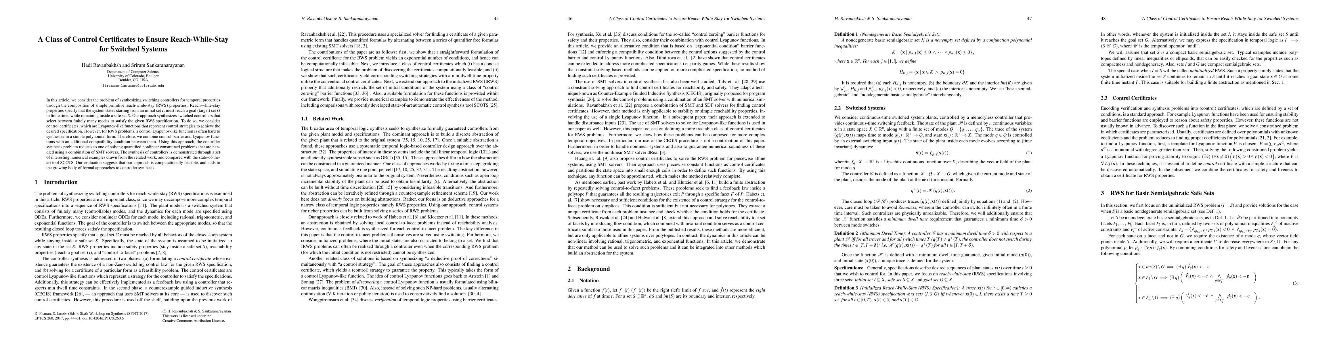 In this article, we consider the problem of synthesizing switching controllers for temporal properties through the composition of simple primitive reach-while-stay (RWS) properties. Reach-while-stay properties specify that the system states starting from an initial set I, must reach a goal (target) set G in finite time, while remaining inside a safe set S. Our approach synthesizes switched controllers that select between finitely many modes to satisfy the given RWS specification. To do so, we consider control certificates, which are Lyapunov-like functions that represent control strategies to achieve the desired specification. However, for RWS problems, a control Lyapunov-like function is often hard to synthesize in a simple polynomial form. Therefore, we combine control barrier and Lyapunov functions with an additional compatibility condition between them. Using this approach, the controller synthesis problem reduces to one of solving quantified nonlinear constrained problems that are handled using a combination of SMT solvers. The synthesis of controllers is demonstrated through a set of interesting numerical examples drawn from the related work, and compared with the state-of-the-art tool SCOTS. Our evaluation suggests that our approach is computationally feasible, and adds to the growing body of formal approaches to controller synthesis.