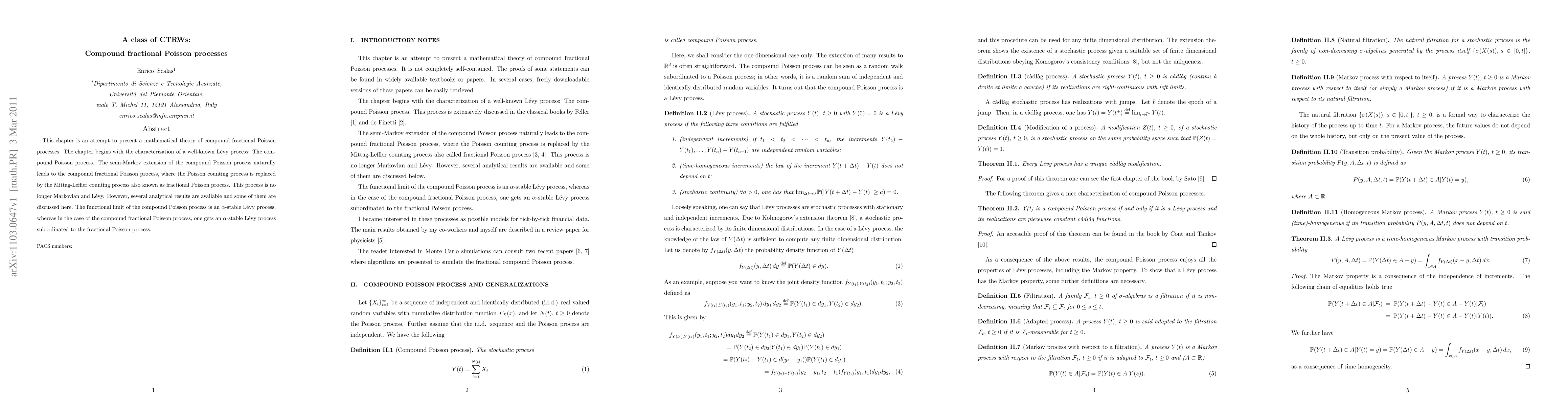 This chapter is an attempt to present a mathematical theory of compound fractional Poisson processes. The chapter begins with the characterization of a well-known L\'evy process: The compound Poisson process. The semi-Markov extension of the compound Poisson process naturally leads to the compound fractional Poisson process, where the Poisson counting process is replaced by the Mittag-Leffler counting process also known as fractional Poisson process. This process is no longer Markovian and L\'evy. However, several analytical results are available and some of them are discussed here. The functional limit of the compound Poisson process is an $\alpha$-stable L\'evy process, whereas in the case of the compound fractional Poisson process, one gets an $\alpha$-stable L\'evy process subordinated to the fractional Poisson process.