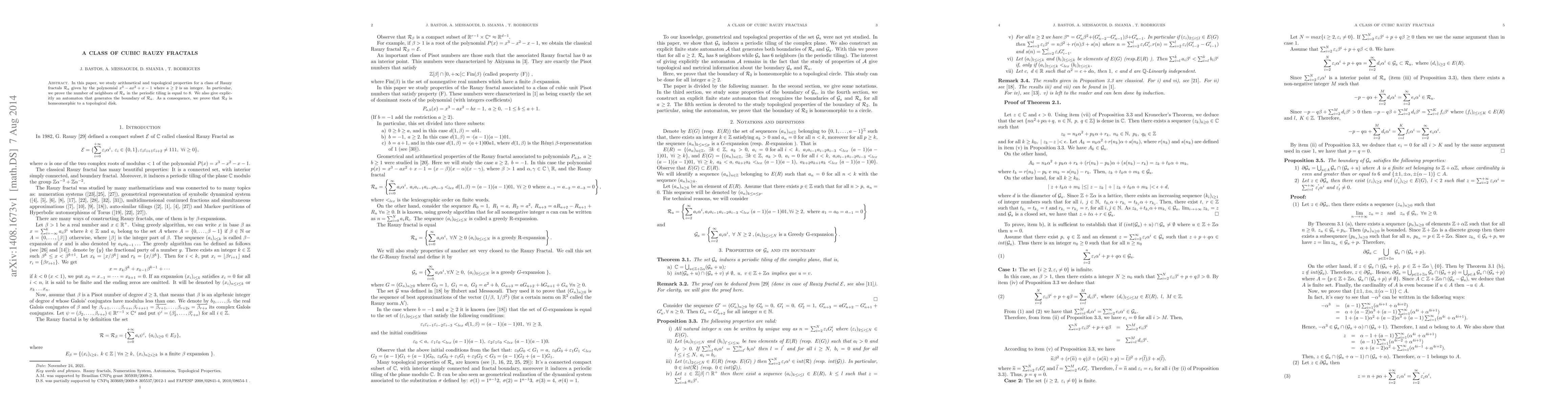 This paper investigates arithmetical and topological properties of a class of cubic Rauzy fractals defined by the polynomial $x^3- ax^2+x-1$ for $a \geq 2$. It proves that these fractals have 8 neighbors in periodic tiling and provides an automaton generating their boundary, concluding that ${\mathcal R}_2$ is homeomorphic to a topological disk.
