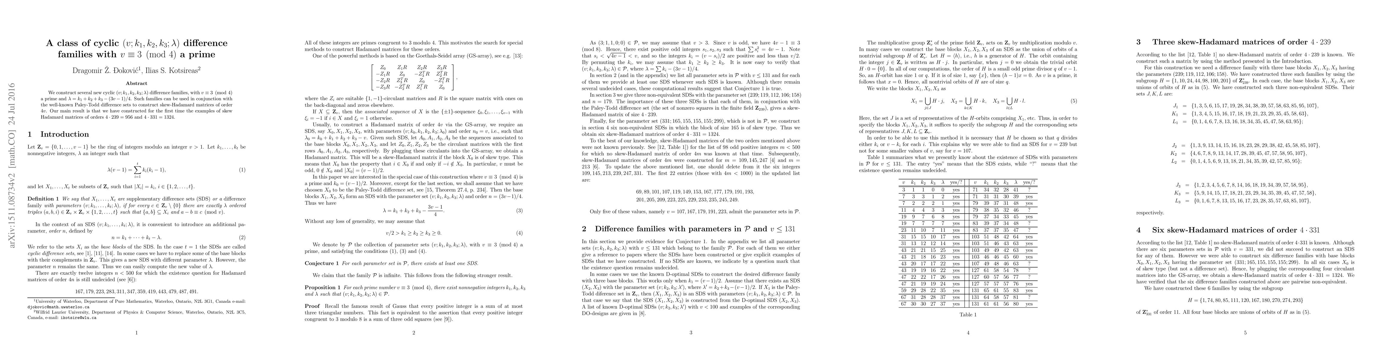 This paper constructs cyclic $(v;k_1,k_2,k_3;\lambda)$ difference families for prime $v\equiv3 \pmod{4}$, enabling the creation of skew-Hadamard matrices of order $4v$. The authors present the first examples of such matrices for orders 956 and 1324.