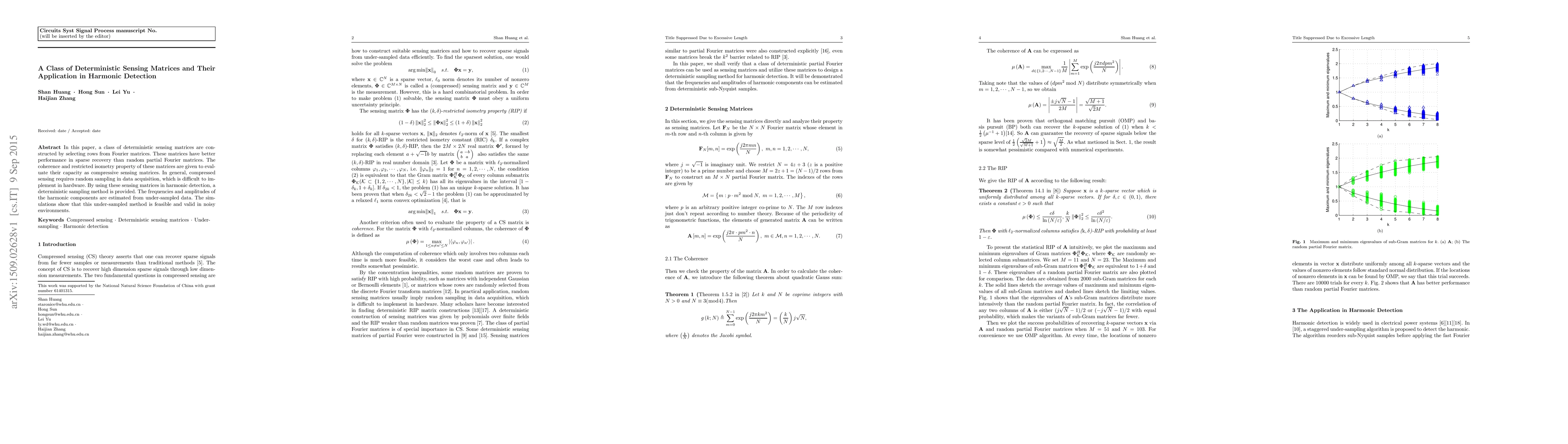 The construction of a novel class of deterministic sensing matrices and their application in harmonic detection, providing a deterministic alternative to random sampling in compressive sensing.