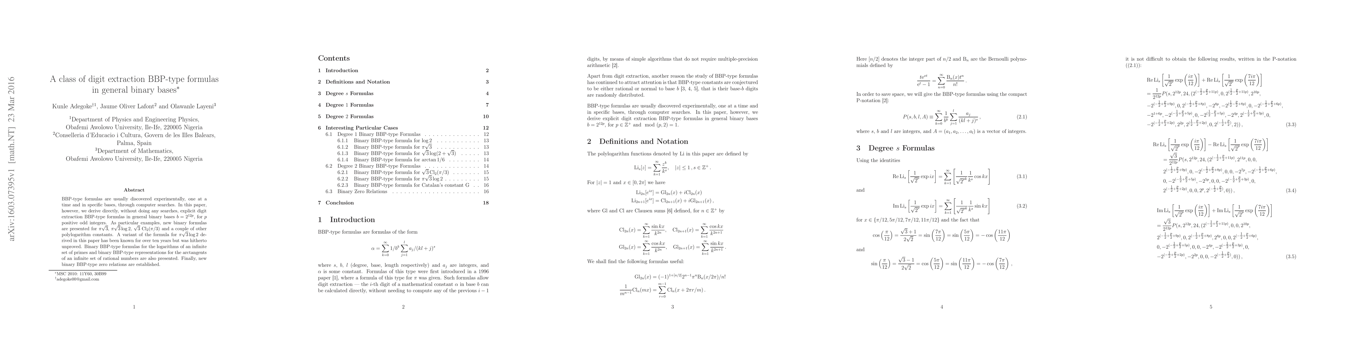 The paper derives explicit digit extraction BBP-type formulas in general binary bases $b=2^{12p}$ for positive odd integers $p$ without computational searches.