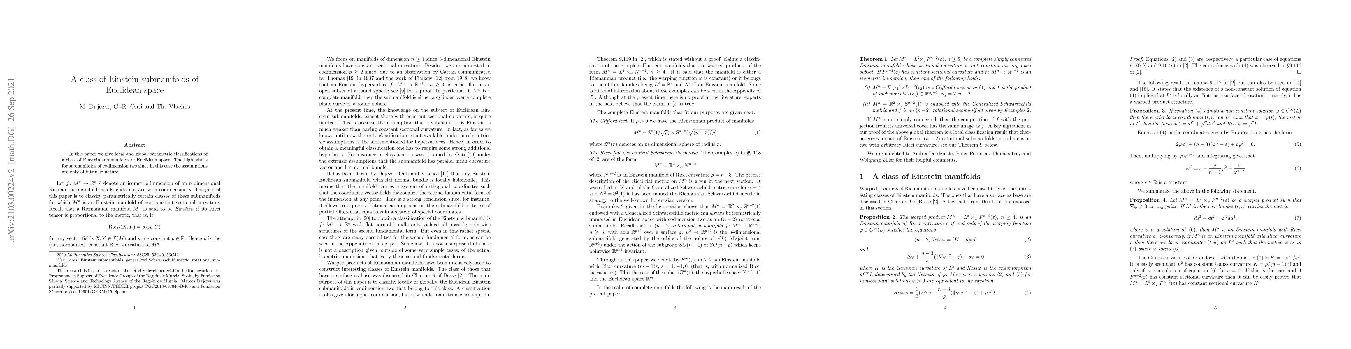 This paper provides local and global parametric classifications of a class of Einstein submanifolds in Euclidean space, with a special focus on those of codimension two, where the assumptions are purely intrinsic.