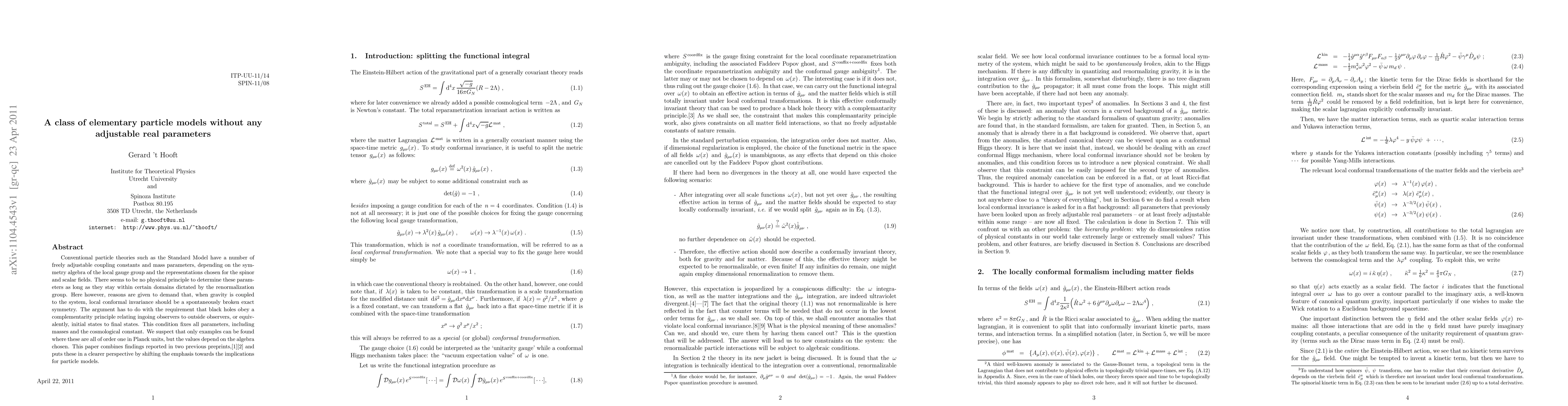 Conventional particle theories such as the Standard Model have a number of freely adjustable coupling constants and mass parameters, depending on the symmetry algebra of the local gauge group and the representations chosen for the spinor and scalar fields. There seems to be no physical principle to determine these parameters as long as they stay within certain domains dictated by the renormalization group. Here however, reasons are given to demand that, when gravity is coupled to the system, local conformal invariance should be a spontaneously broken exact symmetry. The argument has to do with the requirement that black holes obey a complementarity principle relating ingoing observers to outside observers, or equivalently, initial states to final states. This condition fixes all parameters, including masses and the cosmological constant. We suspect that only examples can be found where these are all of order one in Planck units, but the values depend on the algebra chosen. This paper combines findings reported in two previous preprints, and puts these in a clearer perspective by shifting the emphasis towards the implications for particle models.