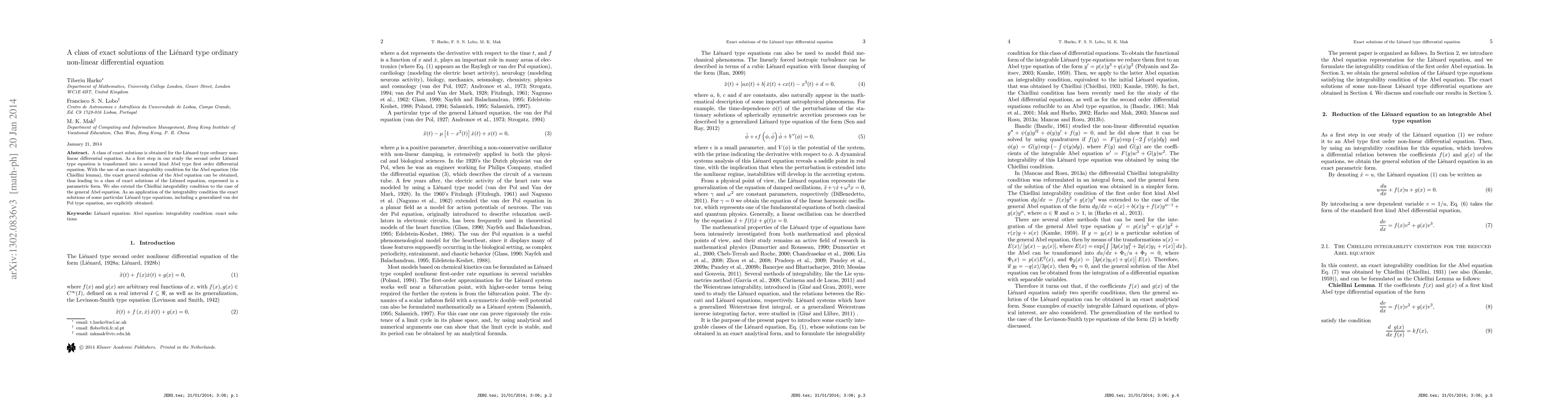 This paper presents a method to derive exact solutions for Liénard type ordinary non-linear differential equations by transforming them into Abel type first-order differential equations. Utilizing the Chiellini lemma, it provides a parametric form for the solutions and extends the integrability condition to general Abel equations, demonstrating its application through specific Liénard and generalized van der Pol equations.
