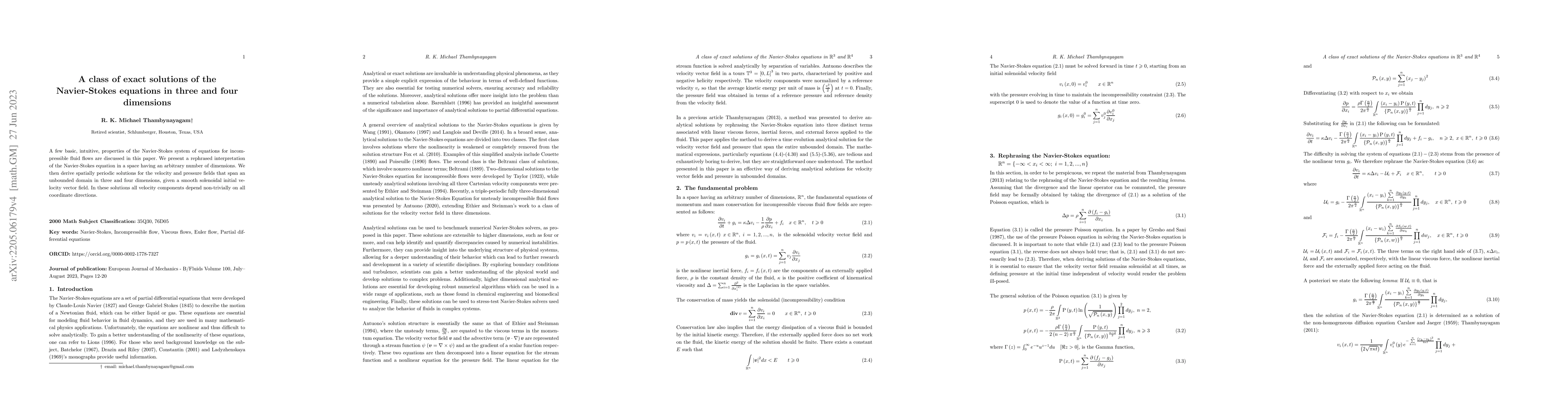 This paper reinterprets the Navier-Stokes equations for incompressible fluid flows in arbitrary dimensions and derives exact, spatially periodic solutions for velocity and pressure fields in three and four dimensions, given a smooth initial velocity field. These solutions exhibit non-trivial dependencies on all coordinate directions.