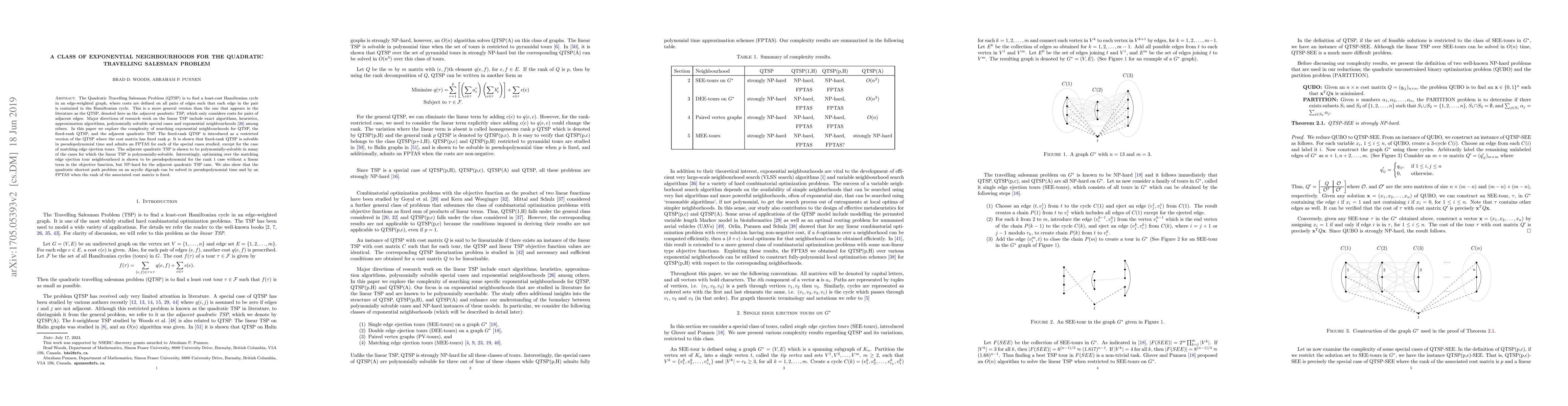 Researchers explore the complexity of finding optimal solutions for the Quadratic Travelling Salesman Problem (QTSP) using exponential neighbourhoods, and find that certain cases can be solved in pseudopolynomial time or with approximate algorithms.