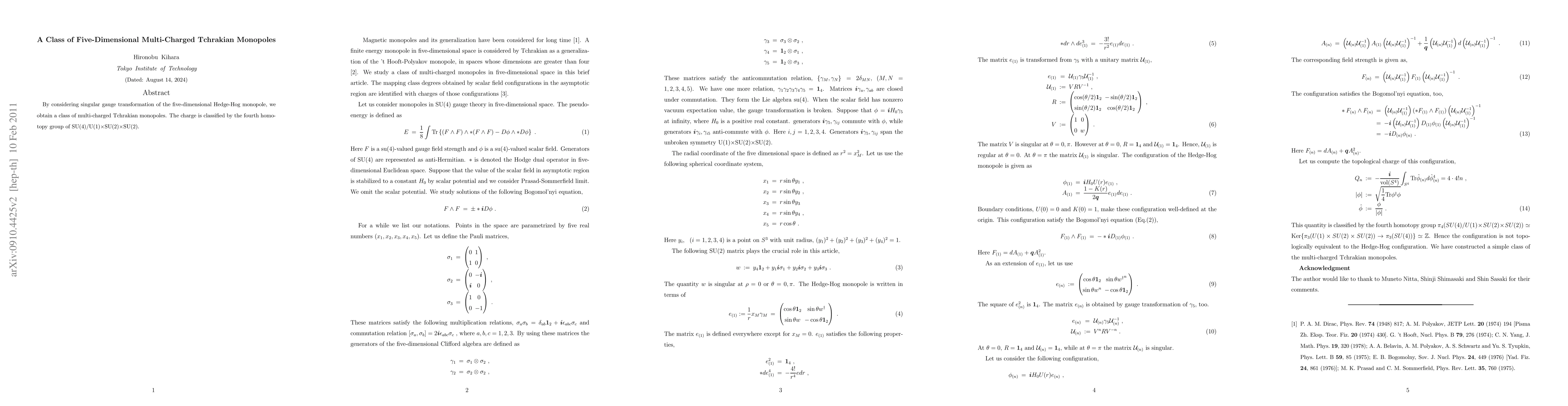 By considering singular gauge transformations of the five-dimensional Hedge-Hog monopole, we obtain a class of multi-charged Tchrakian monopoles. The charge is classified by the fourth homotopy group of SU(4)/U(1)xSU(2)xSU(2).