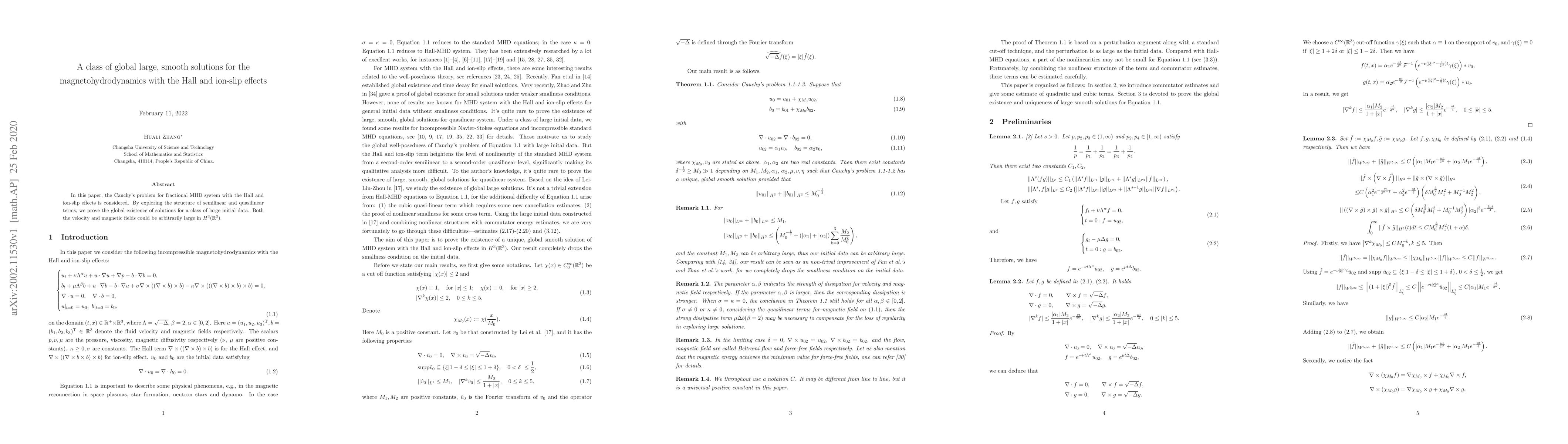 This paper proves the global existence of large, smooth solutions for the fractional magnetohydrodynamics (MHD) system incorporating Hall and ion-slip effects, demonstrating that both velocity and magnetic fields can be arbitrarily large in $H^3(\mathbb{R}^3)$. The analysis leverages the structure of semilinear and quasilinear terms.