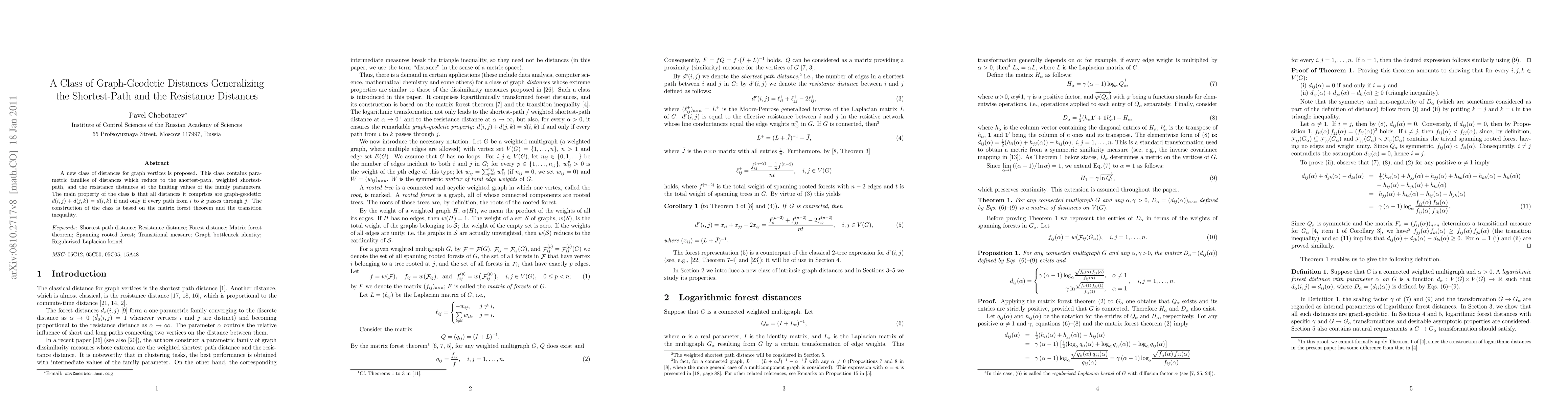 A new class of distances for graph vertices is proposed. This class contains parametric families of distances which reduce to the shortest-path, weighted shortest-path, and the resistance distances at the limiting values of the family parameters. The main property of the class is that all distances it comprises are graph-geodetic: $d(i,j)+d(j,k)=d(i,k)$ if and only if every path from $i$ to $k$ passes through $j$. The construction of the class is based on the matrix forest theorem and the transition inequality.