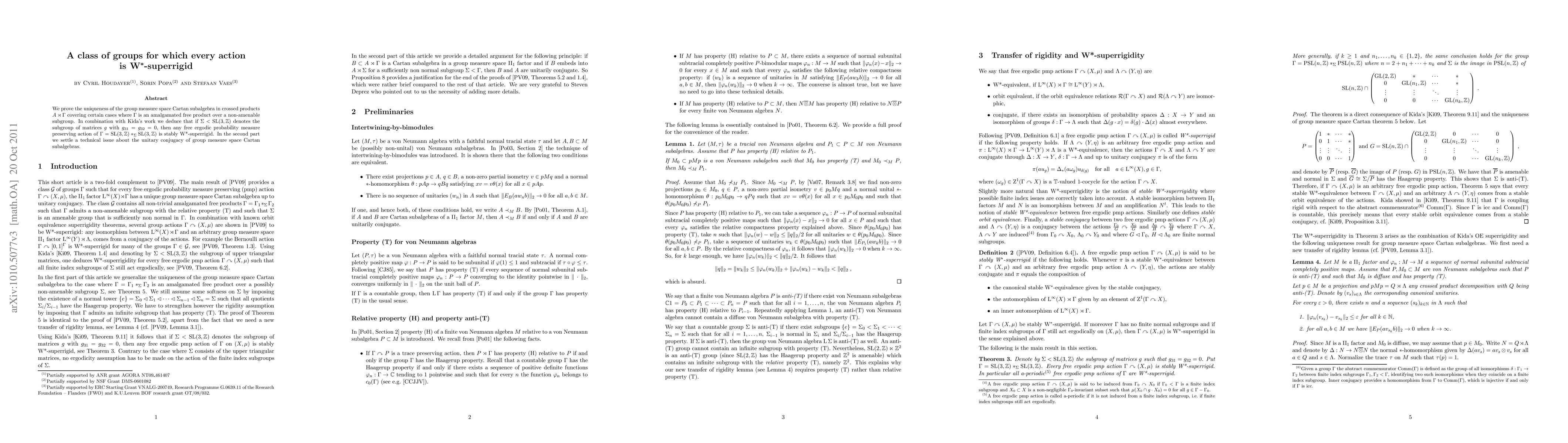 We prove the uniqueness of the group measure space Cartan subalgebra in crossed products A \rtimes \Gamma covering certain cases where \Gamma is an amalgamated free product over a non-amenable subgroup. In combination with Kida's work we deduce that if \Sigma < SL(3,\Z) denotes the subgroup of matrices g with g_31 = g_32 = 0, then any free ergodic probability measure preserving action of \Gamma = SL(3,\Z) *_\Sigma SL(3,\Z) is stably W*-superrigid. In the second part we settle a technical issue about the unitary conjugacy of group measure space Cartan subalgebras.