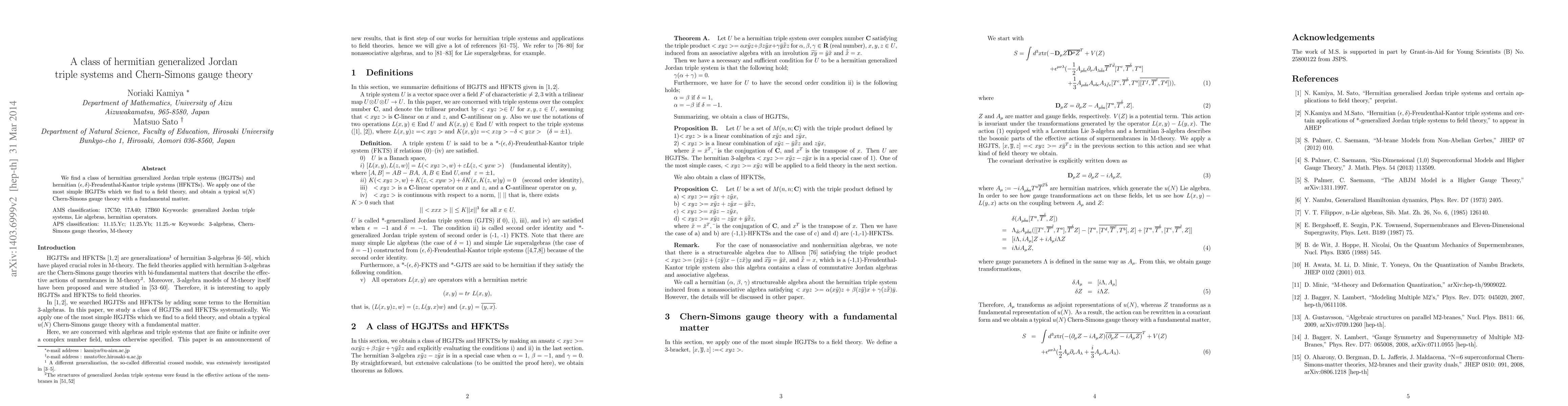 We find a class of hermitian generalized Jordan triple systems (HGJTSs) and hermitian $(\epsilon, \delta)$-Freudenthal-Kantor triple systems (HFKTSs). We apply one of the most simple HGJTSs which we find to a field theory, and obtain a typical u(N) Chern-Simons gauge theory with a fundamental matter.