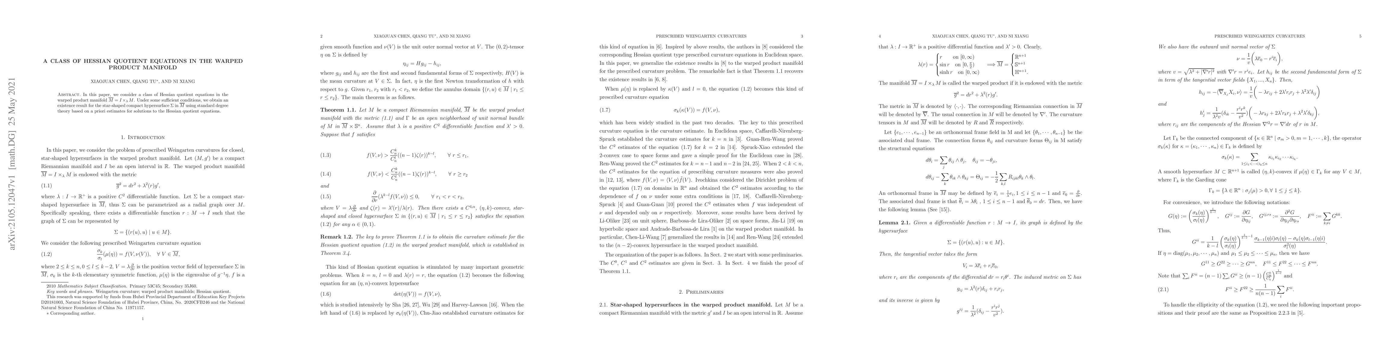 Researchers found a way to create star-shaped compact hypersurfaces in a specific warped product manifold using Hessian quotient equations under certain conditions. They achieved this through degree theory based on priori estimates for the equation's solutions.