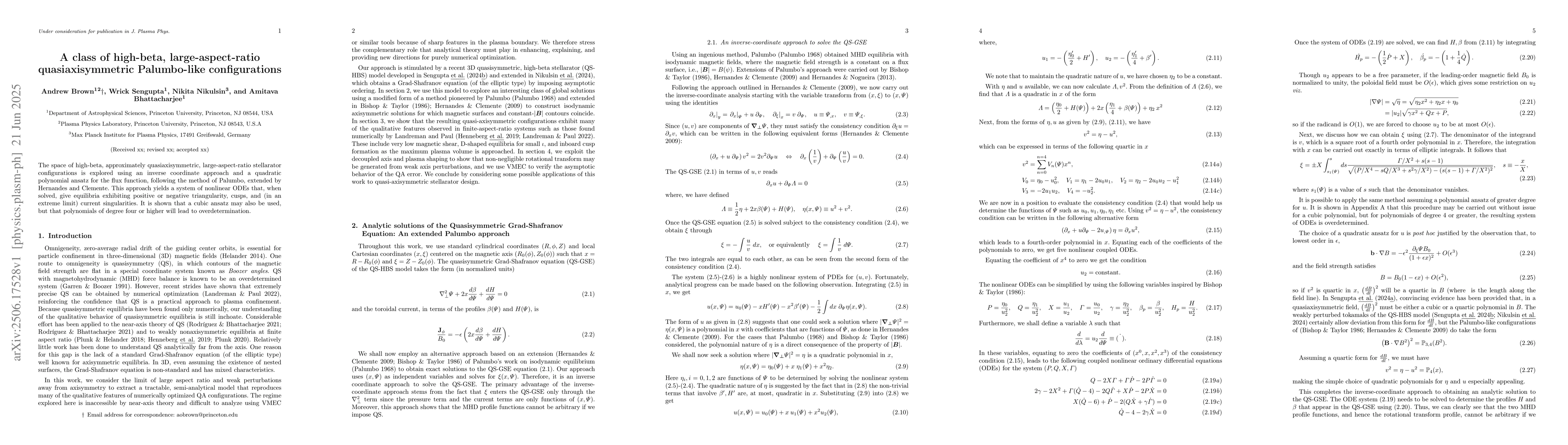 The space of high-beta, approximately quasiaxisymmetric, large-aspect-ratio stellarator configurations is explored using an inverse coordinate approach and a quadratic polynomial ansatz for the flux function, following the method of Palumbo, extended by Hernandes and Clemente. This approach yields a system of nonlinear ODEs that, when solved, give equilibria exhibiting positive or negative triangularity, cusps, and (in an extreme limit) current singularities. It is shown that a cubic ansatz may also be used, but that polynomials of degree four or higher will lead to overdetermination.