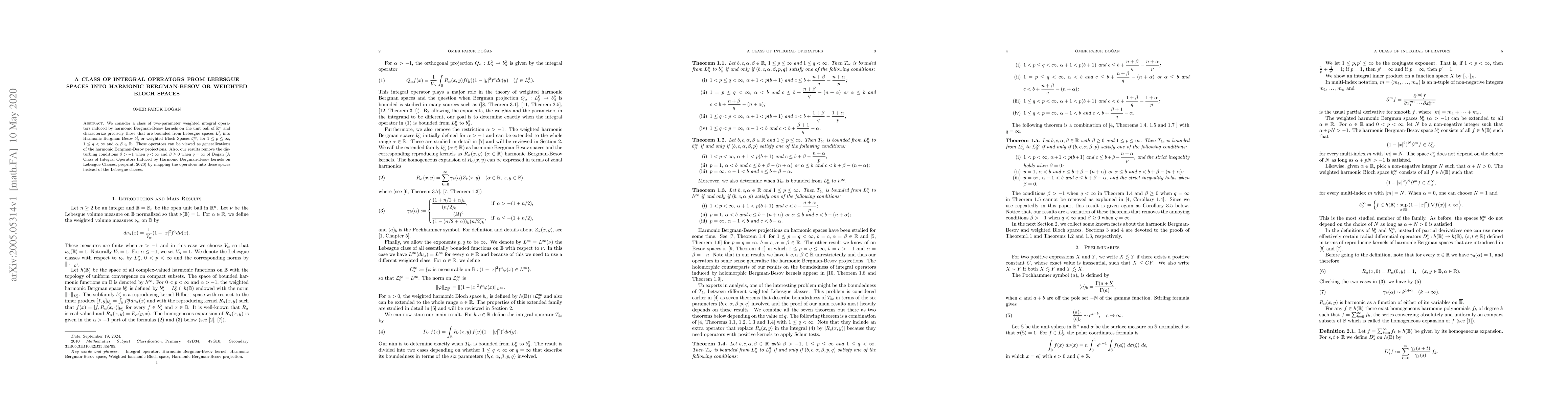 This paper studies two-parameter weighted integral operators on the unit ball in $\mathbb{R}^{n}$ and determines conditions for these operators to be bounded from Lebesgue spaces $L^{p}_{\alpha}$ into Harmonic Bergman-Besov $b^{q}_{\beta}$ or weighted Bloch $b^{\infty}_{\beta}$ spaces. It generalizes prior results by eliminating restrictive conditions on $\beta$.