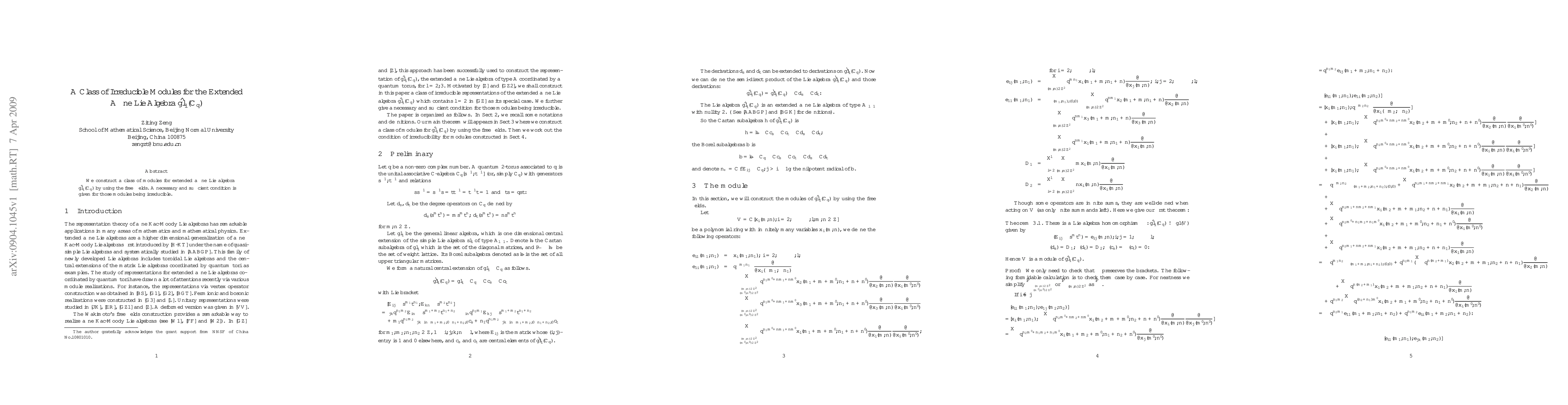 This paper constructs a class of irreducible modules for the extended affine Lie algebra $\widetilde{\frak{gl}_l({\mathbb{C}_q})}$ using free fields and provides a necessary and sufficient condition for their irreducibility.
