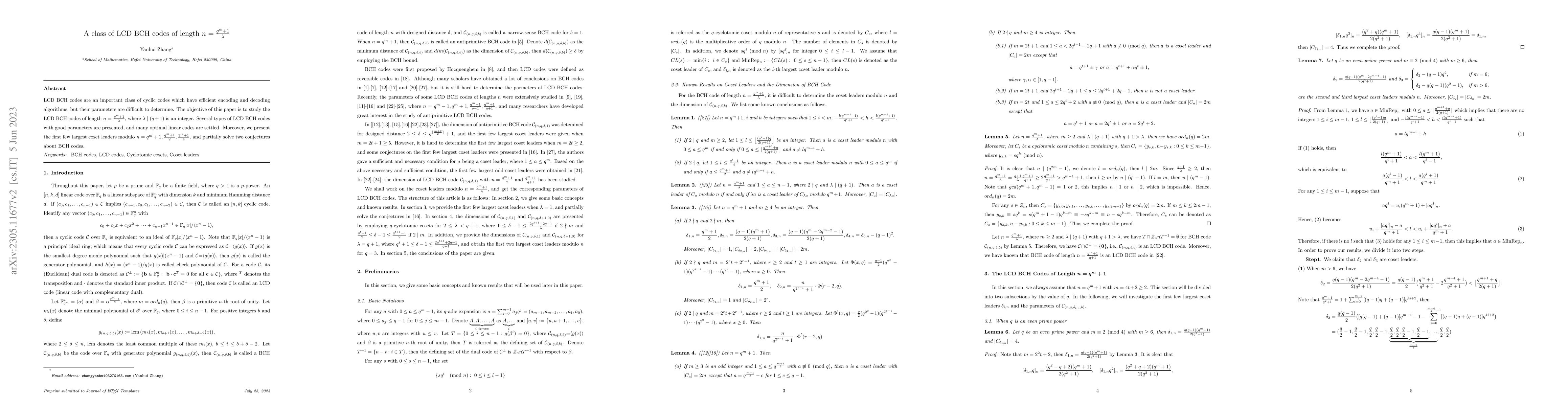 This paper investigates LCD BCH codes of length $n=\frac{q^{m}+1}{\lambda}$ with $\lambda\mid (q+1)$, presenting several types with favorable parameters and resolving many optimal linear codes. It also addresses the largest coset leaders for specific moduli and partially solves two conjectures regarding BCH codes.