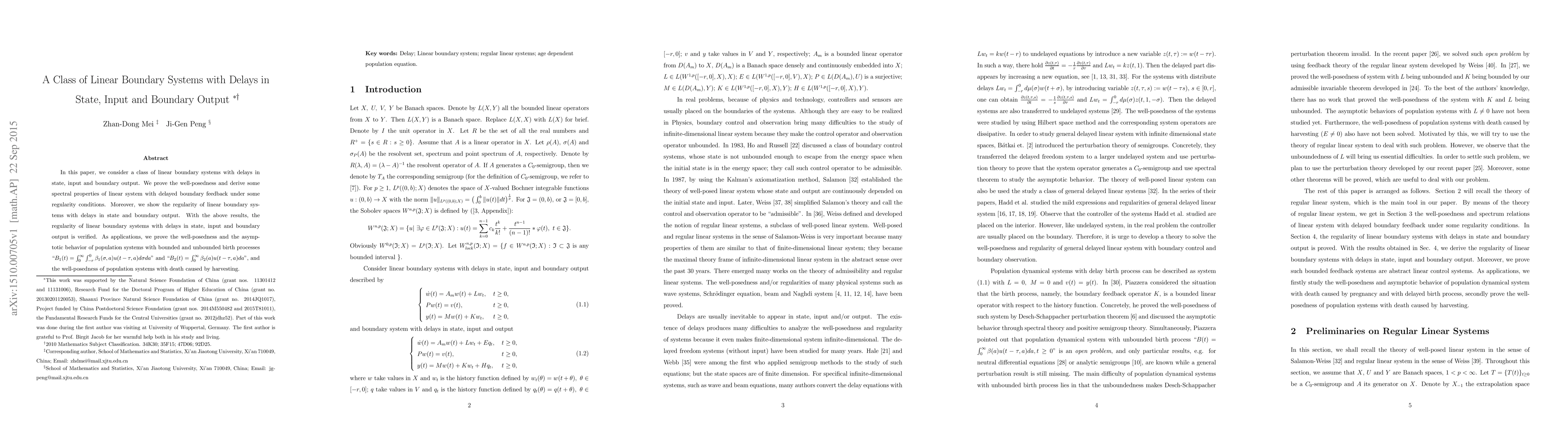 In this paper, we consider a class of linear boundary systems with delays in state, input and boundary output. We prove the well-posedness and derive some spectral properties of linear system with delayed boundary feedback under some regularity conditions. Moreover, we show the regularity of linear boundary systems with delays in state and boundary output. With the above results, the regularity of linear boundary systems with delays in state, input and boundary output is verified. As applications, we prove the well-posedness and the asymptotic behavior of population systems with bounded and unbounded birth processes "$B_1(t)=\int_0^\infty\int_{-r}^0\beta_1(\sigma,a)u(t-\tau,a)d\sigma da$" and "$B_2(t)=\int_0^\infty\beta_2(a)u(t-\tau,a)da$", and the well-posedness of population systems with death caused by harvesting.