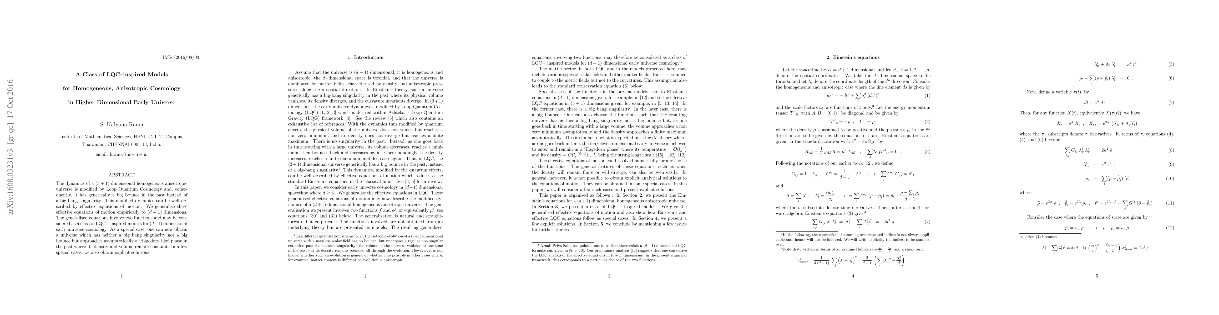 The dynamics of a (3 + 1) dimensional homogeneous anisotropic universe is modified by Loop Quantum Cosmology and, consequently, it has generically a big bounce in the past instead of a big-bang singularity. This modified dynamics can be well described by effective equations of motion. We generalise these effective equations of motion empirically to (d + 1) dimensions. The generalised equations involve two functions and may be considered as a class of LQC -- inspired models for (d + 1) dimensional early universe cosmology. As a special case, one can now obtain a universe which has neither a big bang singularity nor a big bounce but approaches asymptotically a `Hagedorn like' phase in the past where its density and volume remain constant. In a few special cases, we also obtain explicit solutions.
