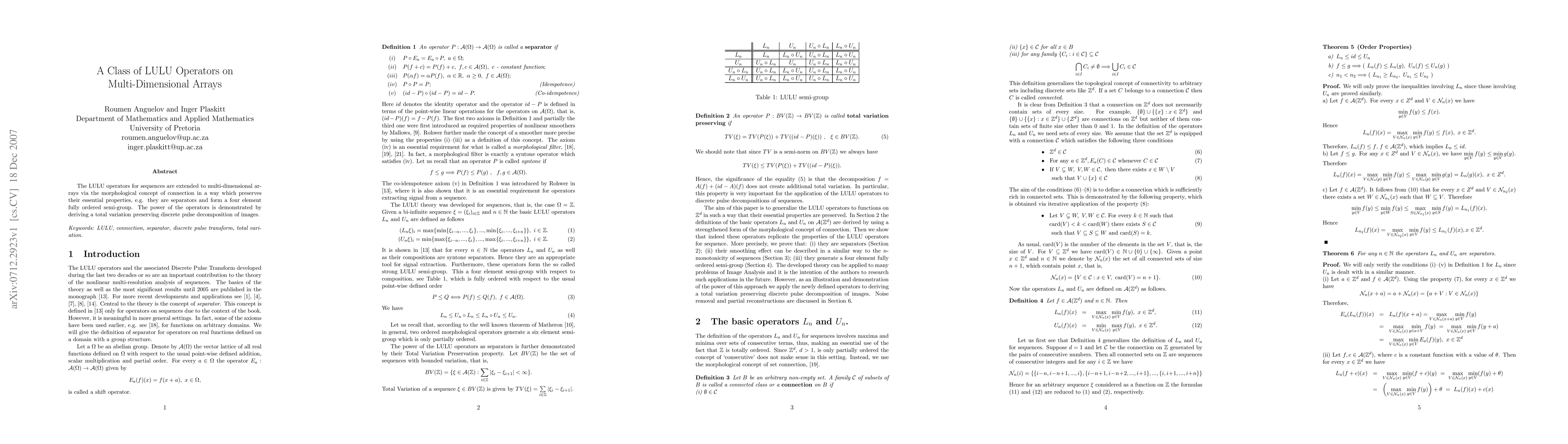 This paper extends LULU operators from sequences to multi-dimensional arrays using morphological connections, maintaining their properties as separators and forming a fully ordered semi-group. The effectiveness of these operators is showcased through a total variation preserving discrete pulse decomposition of images.