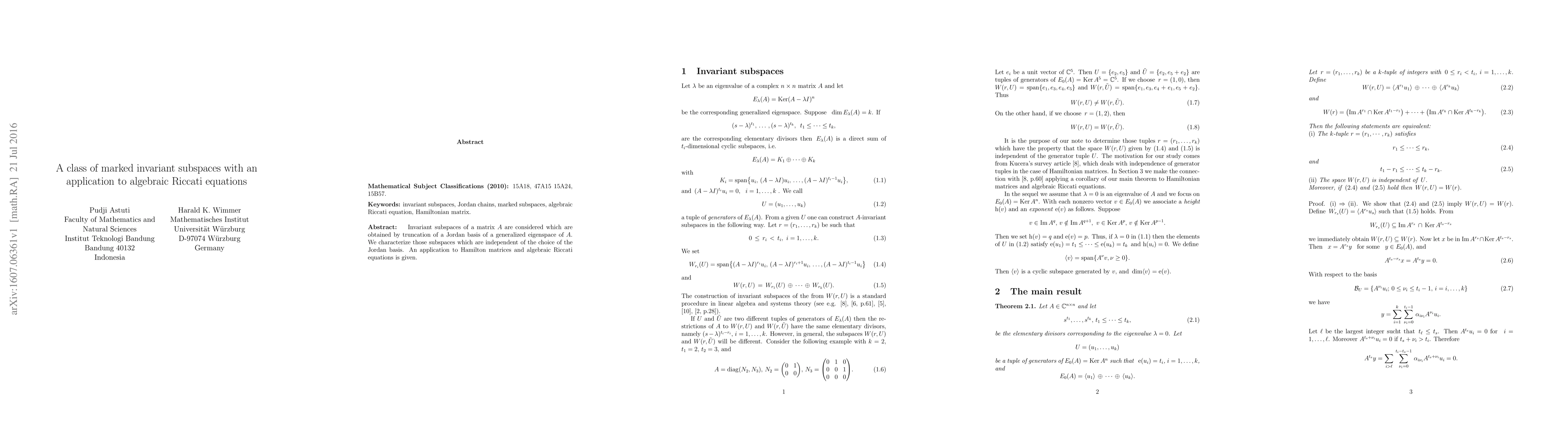 This paper identifies invariant subspaces of matrix $A$ derived from truncated Jordan bases of generalized eigenspaces, characterizing those that remain consistent regardless of the chosen basis. It applies this characterization to Hamilton matrices and algebraic Riccati equations.