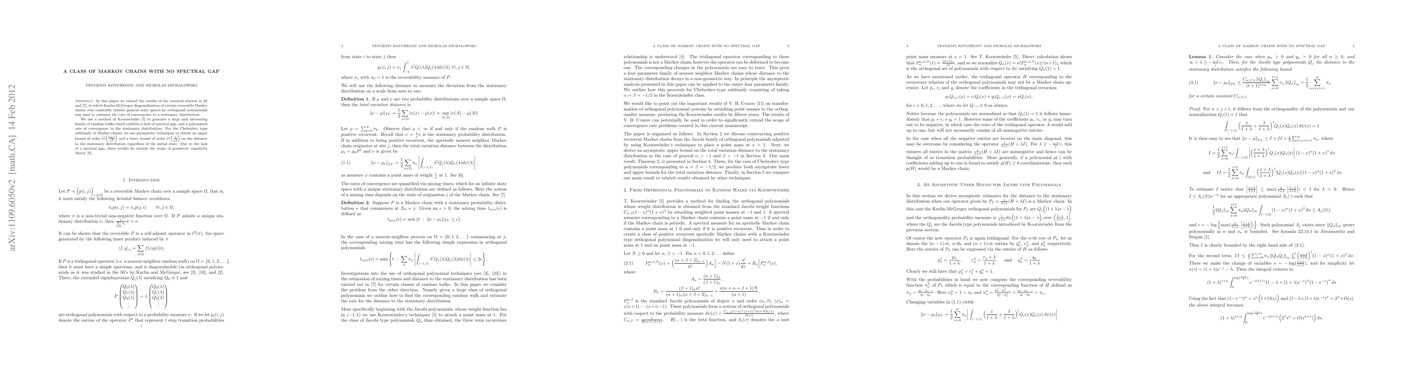 This paper extends previous research on reversible Markov chains by generating a family of random walks with no spectral gap, showing a polynomial convergence rate to the stationary distribution. It uses asymptotic techniques to provide bounds on the distance to the stationary distribution for a Chebyshev type subfamily, highlighting the limitations of geometric ergodicity theory.