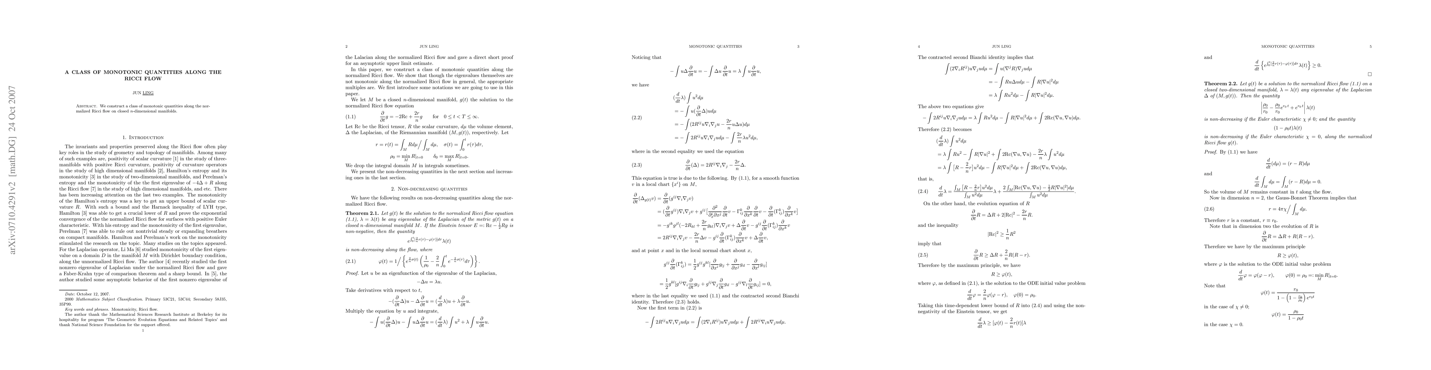 We construct a class of monotonic quantities along the normalized Ricci flow on closed n-dimensional manifolds.