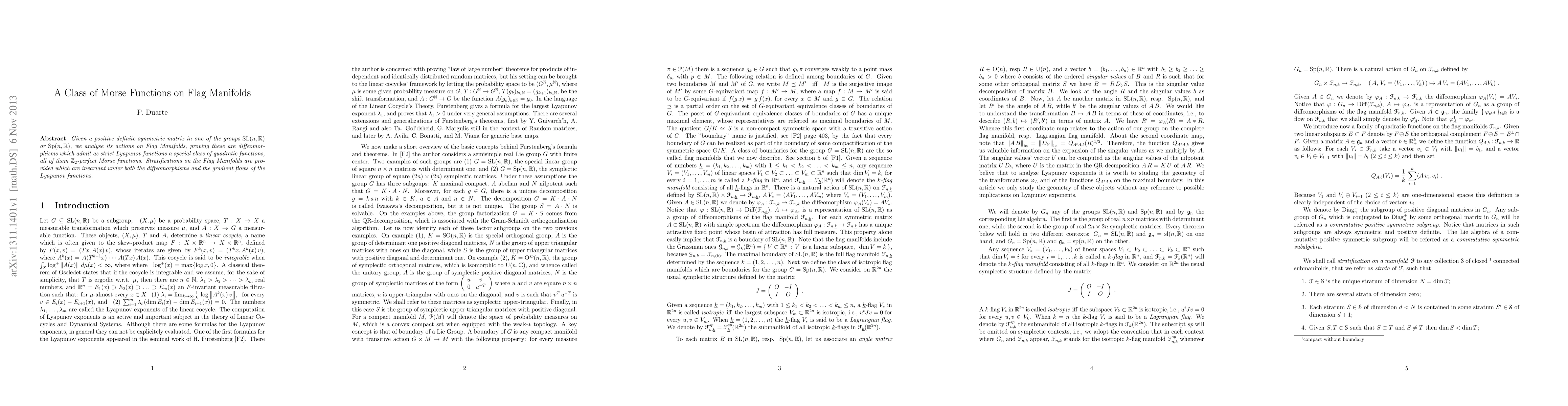 The paper analyzes Morse functions on flag manifolds, specifically examining actions of positive definite symmetric matrices in SL(n, R) and Sp(n, R) which are proven to be diffeomorphisms with Z2-perfect quadratic functions as strict Lyapunov functions. It provides stratifications on flag manifolds that are invariant under both the diffeomorphisms and the gradient flows of the Lyapunov functions.