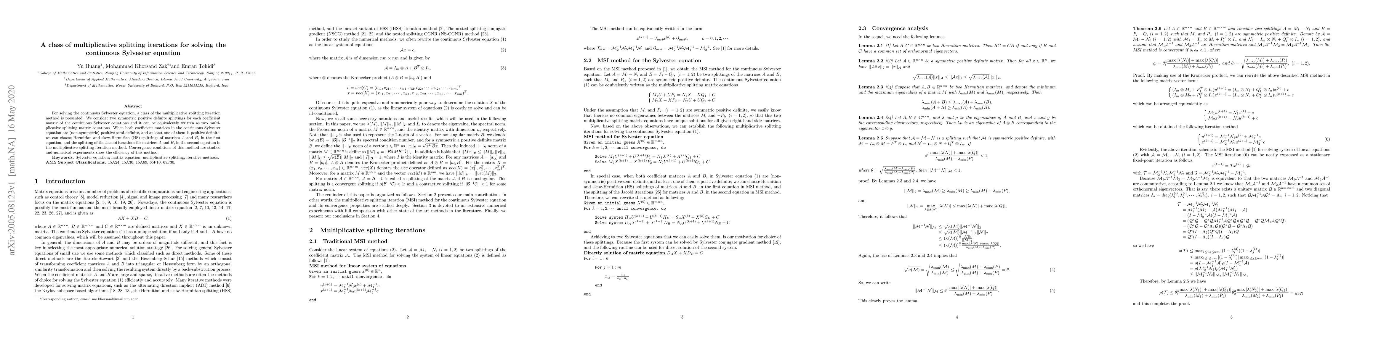 This paper presents a class of multiplicative splitting iteration methods for solving the continuous Sylvester equation, utilizing symmetric positive definite splittings and Hermitian and skew-Hermitian (HS) splittings for convergence. Numerical experiments demonstrate the method's efficiency under specified conditions.