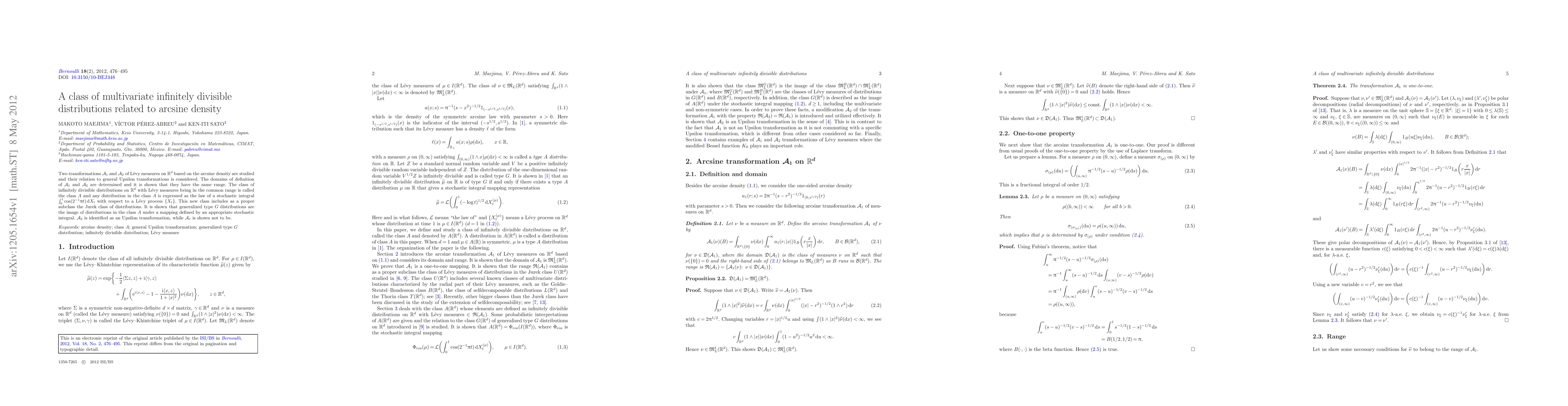 This research introduces two transformations, $mathcal{A}_1$ and $mathcal{A}_2$, based on the arcsine density, which are applied to Lévy measures in $mathbb{R}^d$. It establishes a new class of infinitely divisible distributions, called class $A$, and demonstrates that these distributions can be expressed as stochastic integrals involving a Lévy process. The class $A$ includes the Jurek class as a proper subclass and generalized type $G$ distributions as their image under a specific mapping. The transformation $mathcal{A}_2$ is identified as a Upsilon transformation, while $mathcal{A}_1$ is shown not to be.