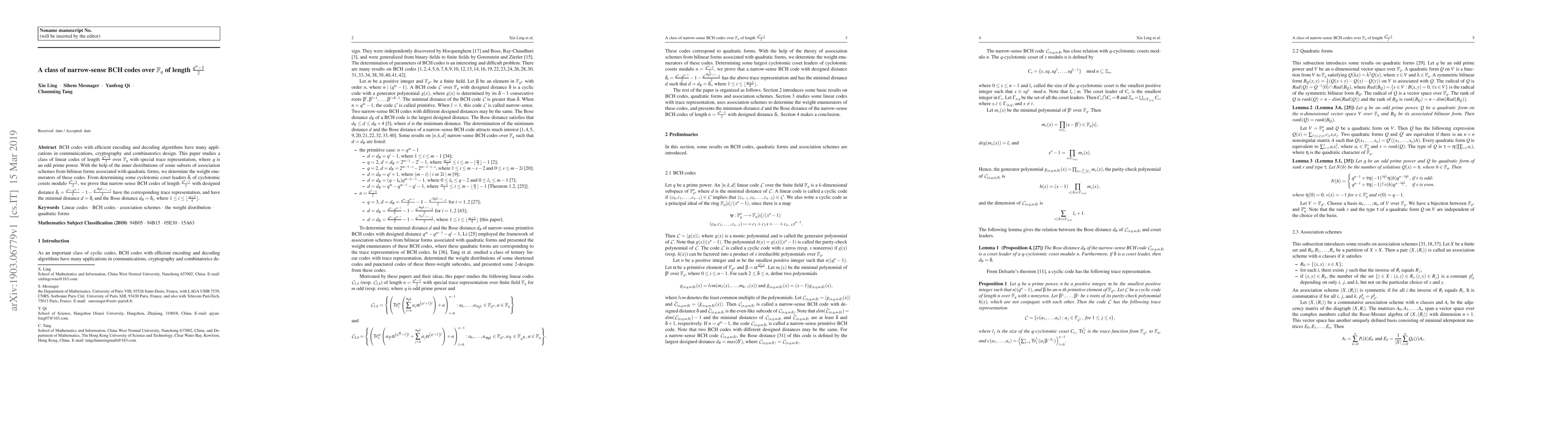 BCH codes with efficient encoding and decoding algorithms have many applications in communications, cryptography and combinatorics design. This paper studies a class of linear codes of length $ \frac{q^m-1}{2}$ over $\mathbb{F}_q$ with special trace representation, where $q$ is an odd prime power. With the help of the inner distributions of some subsets of association schemes from bilinear forms associated with quadratic forms, we determine the weight enumerators of these codes. From determining some cyclotomic coset leaders $\delta_i$ of cyclotomic cosets modulo $ \frac{q^m-1}{2}$, we prove that narrow-sense BCH codes of length $ \frac{q^m-1}{2}$ with designed distance $\delta_i=\frac{q^m-q^{m-1}}{2}-1-\frac{q^{ \lfloor \frac{m-3}{2} \rfloor+i}-1}{2}$ have the corresponding trace representation, and have the minimal distance $d=\delta_i$ and the Bose distance $d_B=\delta_i$, where $1\leq i\leq \lfloor \frac{m+3}{4} \rfloor$.