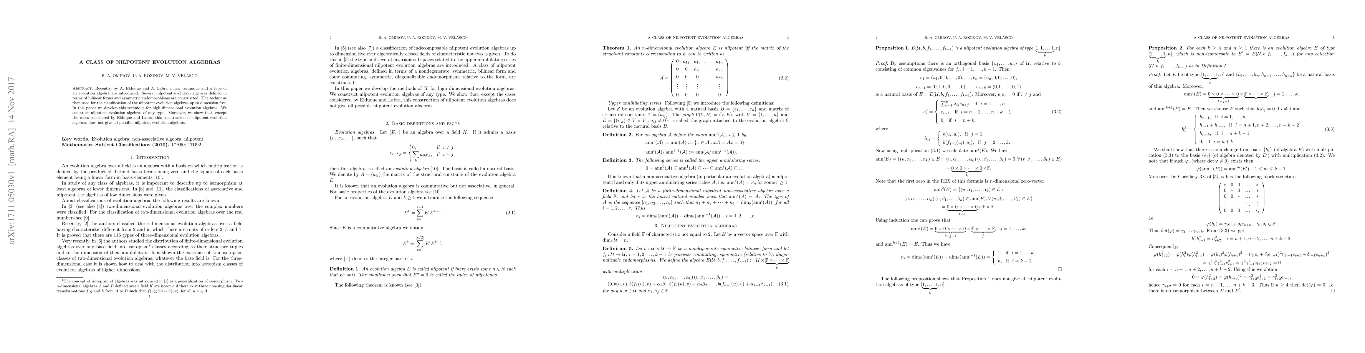 Recently, by A. Elduque and A. Labra a new technique and a type of an evolution algebra are introduced. Several nilpotent evolution algebras defined in terms of bilinear forms and symmetric endomorphisms are constructed. The technique then used for the classification of the nilpotent evolution algebras up to dimension five. In this paper we develop this technique for high dimensional evolution algebras. We construct nilpotent evolution algebras of any type. Moreover, we show that, except the cases considered by Elduque and Labra, this construction of nilpotent evolution algebras does not give all possible nilpotent evolution algebras.