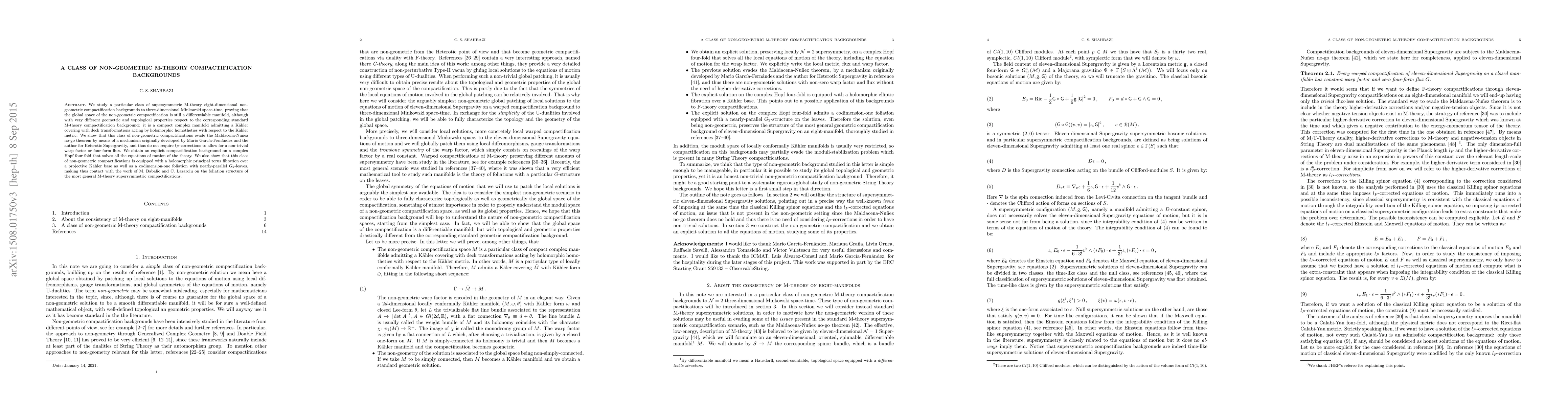 This paper explores a class of eight-dimensional non-geometric M-theory compactifications to three-dimensional Minkowski space that retain a differentiable manifold structure despite differing geometric properties. These compactifications evade the Maldacena-Nuñez theorem without $l_{P}$-corrections, featuring a complex Hopf four-fold solution.