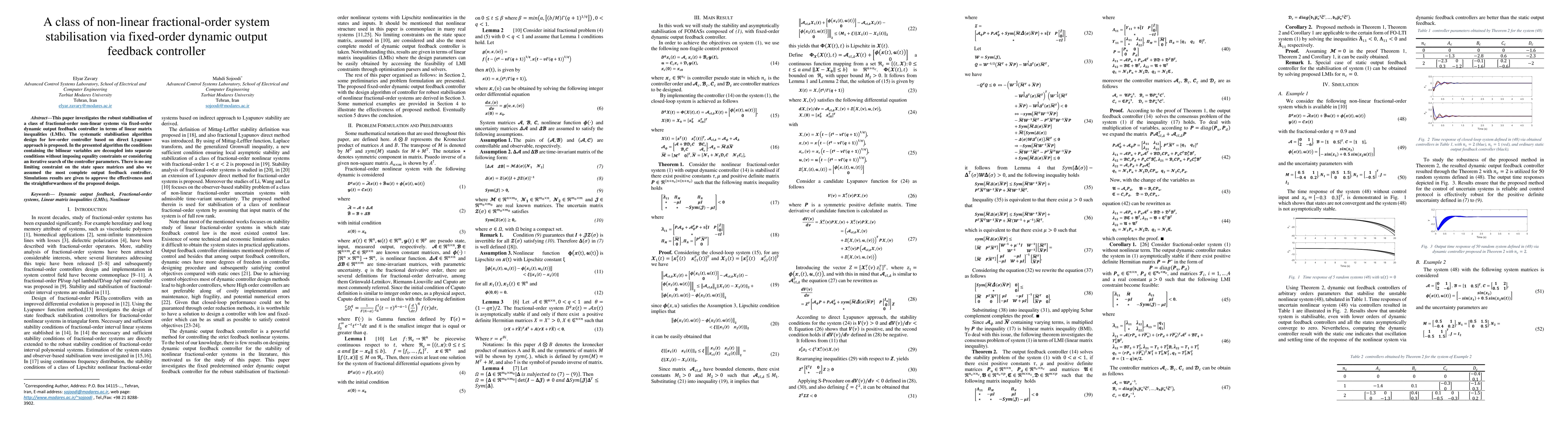 This paper investigates the robust stabilisation of a class of fractional-order non-linear systems via fixed-order dynamic output feedback controller in terms of linear matrix inequalities (LMIs). The systematic stabilisation algorithm design for low-order controller based on direct Lyapunov approach is proposed. In the presented algorithm the conditions containing the bilinear variables are decoupled into separate conditions without imposing equality constraints or considering an iterative search of the controller parameters. There is no any limiting constraint on the state space matrices and also we assumed the most complete output feedback controller. Simulations results are given to approve the effectiveness and the straightforwardness of the proposed design.