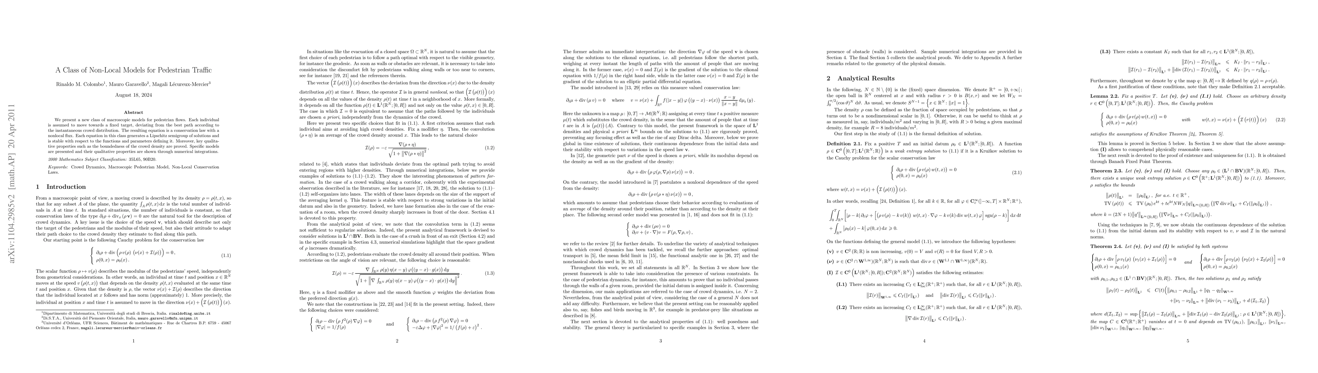 This research introduces a new model for pedestrian traffic, assuming individuals move towards a target while deviating based on crowd distribution. The model is a nonlocal conservation law with a Lipschitz semigroup of solutions, proven stable and demonstrating bounded crowd density. Specific models are presented with supporting numerical integrations.
