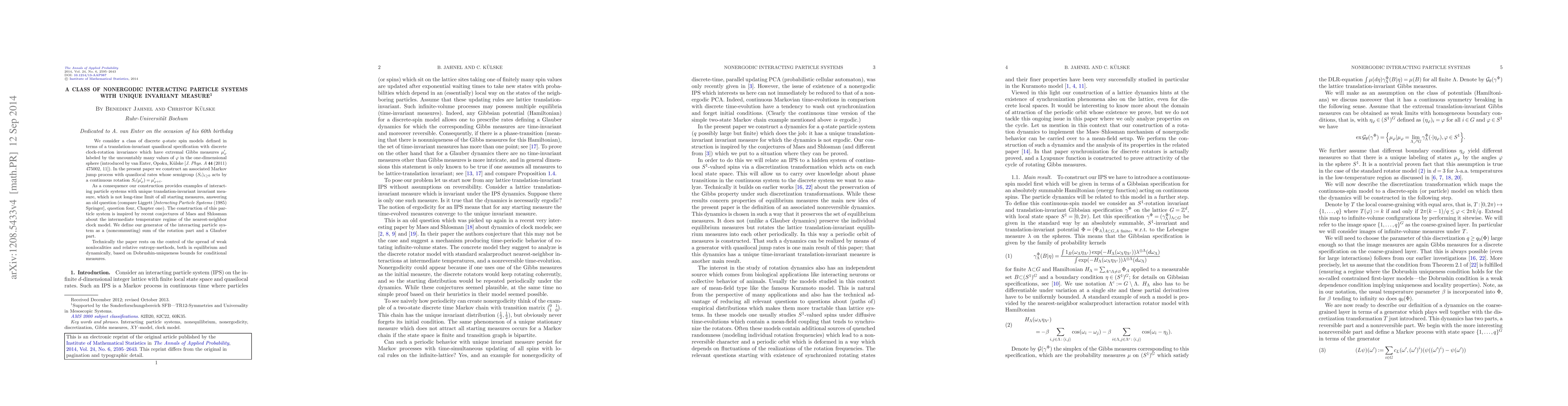 We consider a class of discrete $q$-state spin models defined in terms of a translation-invariant quasilocal specification with discrete clock-rotation invariance which have extremal Gibbs measures $\mu'_{\varphi}$ labeled by the uncountably many values of $\varphi$ in the one-dimensional sphere (introduced by van Enter, Opoku, K\"{u}lske [J. Phys. A 44 (2011) 475002, 11]). In the present paper we construct an associated Markov jump process with quasilocal rates whose semigroup $(S_t)_{t\geq0}$ acts by a continuous rotation $S_t(\mu'_{\varphi})=\mu'_{\varphi +t}$. As a consequence our construction provides examples of interacting particle systems with unique translation-invariant invariant measure, which is not long-time limit of all starting measures, answering an old question (compare Liggett [Interacting Particle Systems (1985) Springer], question four, Chapter one). The construction of this particle system is inspired by recent conjectures of Maes and Shlosman about the intermediate temperature regime of the nearest-neighbor clock model. We define our generator of the interacting particle system as a (noncommuting) sum of the rotation part and a Glauber part. Technically the paper rests on the control of the spread of weak nonlocalities and relative entropy-methods, both in equilibrium and dynamically, based on Dobrushin-uniqueness bounds for conditional measures.