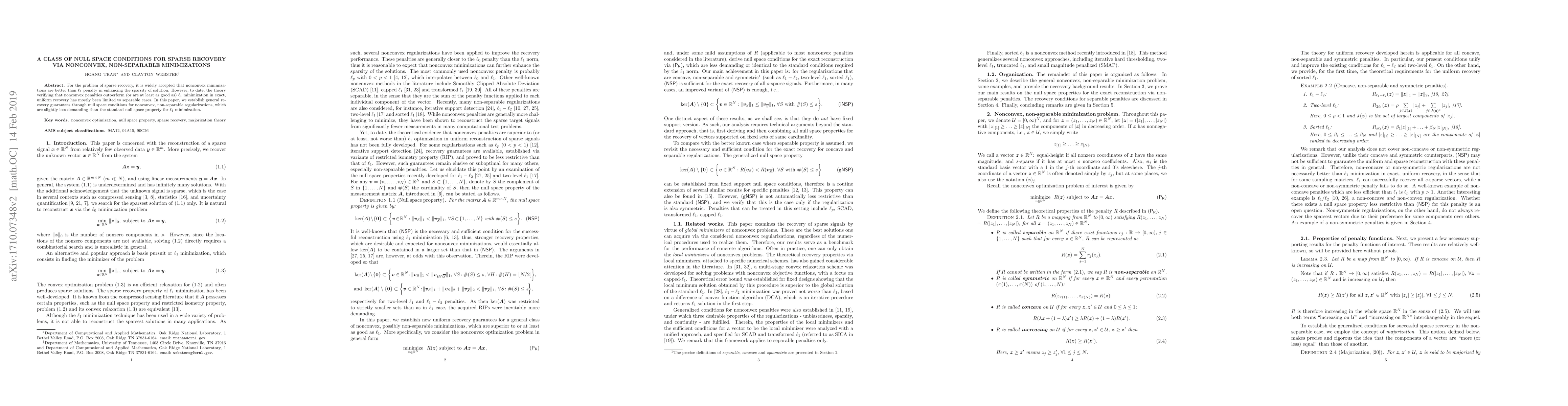 This paper establishes recovery guarantees for sparse solutions via nonconvex, non-separable minimizations, showing that these methods can outperform $\ell_1$ minimization in exact, uniform recovery. The authors provide general null space conditions that are less stringent than those for $\ell_1$ minimization.