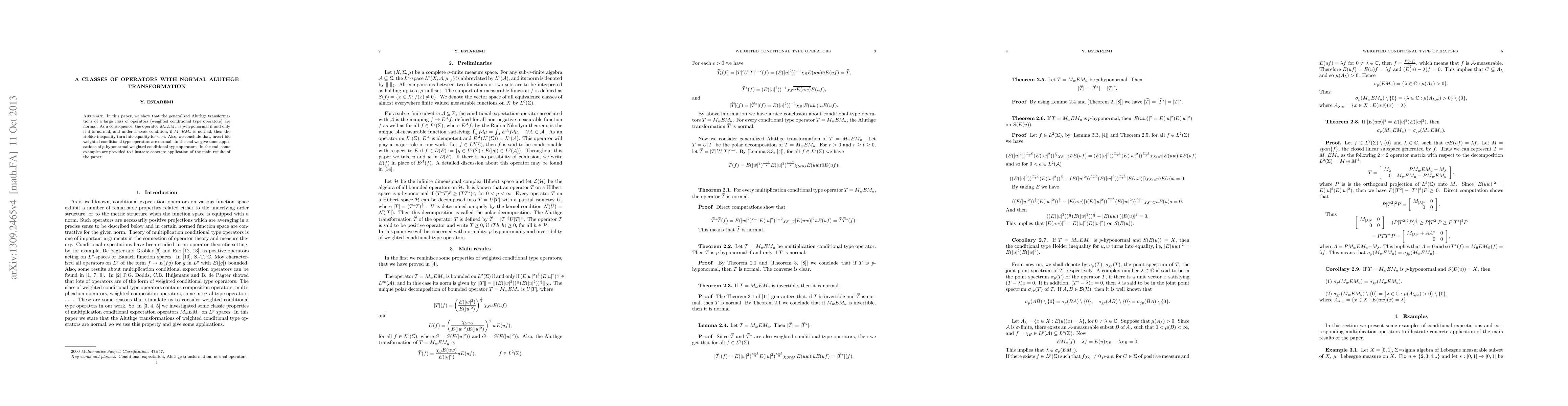 In this paper, we show that the generalized Aluthge transforma- tions of a large class of operators (weighted conditional type operators) are normal. As a consequence, the operator MwEMu is p-hyponormal if and only if it is normal, and under a weak condition, if MwEMu is normal, then the Holder inequality turn into equality for w, u. Also, we conclude that, invertible weighted conditional type operators are normal. In the end we give some appli- cations of p-hyponormal weighted conditional type operators. In the end, some examples are provided to illustrate concrete application of the main results of the paper.