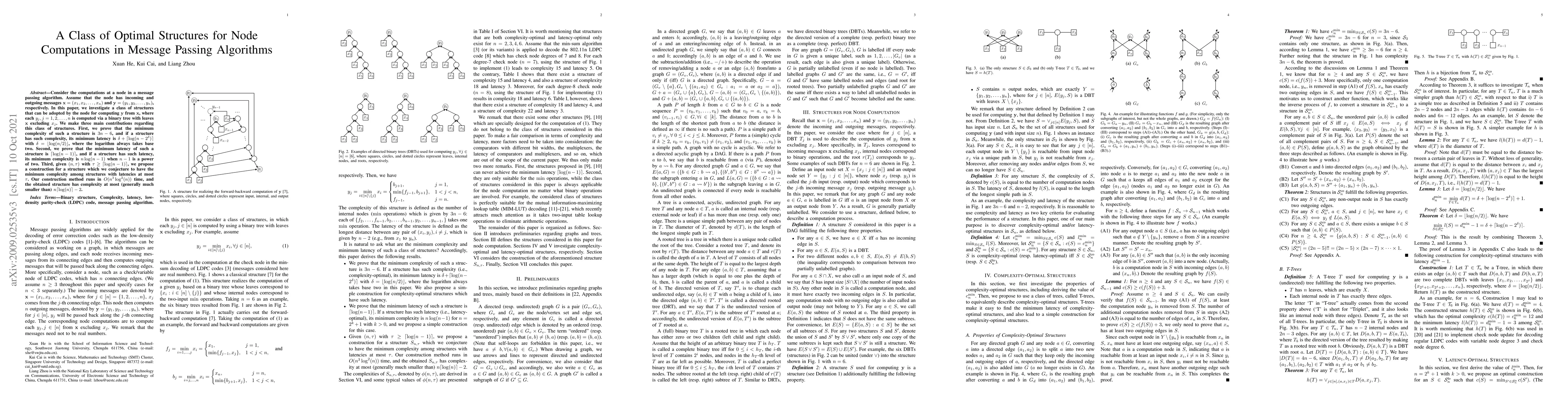 Consider the computations at a node in a message passing algorithm. Assume that the node has incoming and outgoing messages $\mathbf{x} = (x_1, x_2, \ldots, x_n)$ and $\mathbf{y} = (y_1, y_2, \ldots, y_n)$, respectively. In this paper, we investigate a class of structures that can be adopted by the node for computing $\mathbf{y}$ from $\mathbf{x}$, where each $y_j, j = 1, 2, \ldots, n$ is computed via a binary tree with leaves $\mathbf{x}$ excluding $x_j$. We make three main contributions regarding this class of structures. First, we prove that the minimum complexity of such a structure is $3n - 6$, and if a structure has such complexity, its minimum latency is $\delta + \lceil \log(n-2^{\delta}) \rceil$ with $\delta = \lfloor \log(n/2) \rfloor$, where the logarithm always takes base two. Second, we prove that the minimum latency of such a structure is $\lceil \log(n-1) \rceil$, and if a structure has such latency, its minimum complexity is $n \log(n-1)$ when $n-1$ is a power of two. Third, given $(n, \tau)$ with $\tau \geq \lceil \log(n-1) \rceil$, we propose a construction for a structure which we conjecture to have the minimum complexity among structures with latencies at most $\tau$. Our construction method runs in $O(n^3 \log^2(n))$ time, and the obtained structure has complexity at most (generally much smaller than) $n \lceil \log(n) \rceil - 2$.