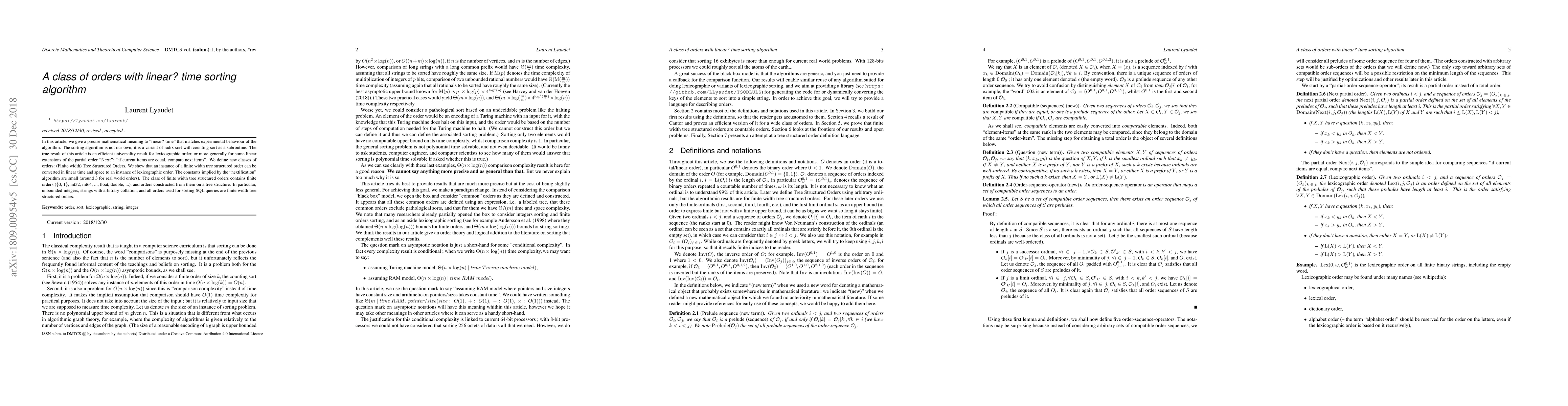 In this article, we give a precise mathematical meaning to `linear? time' that matches experimental behaviour of the algorithm. The sorting algorithm is not our own, it is a variant of radix sort with counting sort as a subroutine. The true result of this article is an efficient universality result for lexicographic order, or more generally for some linear extensions of the partial order `Next': `if current items are equal, compare next items'. We define new classes of orders: (Finite width) Tree Structured Orders. We show that an instance of a finite width tree structured order can be converted in linear time and space to an instance of lexicographic order. The constants implied by the `nextification' algorithm are small (around 3 for real world orders). The class of finite width tree structured orders contains finite orders ({0, 1}, int32, int64, ..., float, double, ...), and orders constructed from them on a tree structure. In particular, unbounded integers, strings with arbitrary collation, and all orders used for sorting SQL queries are finite width tree structured orders.