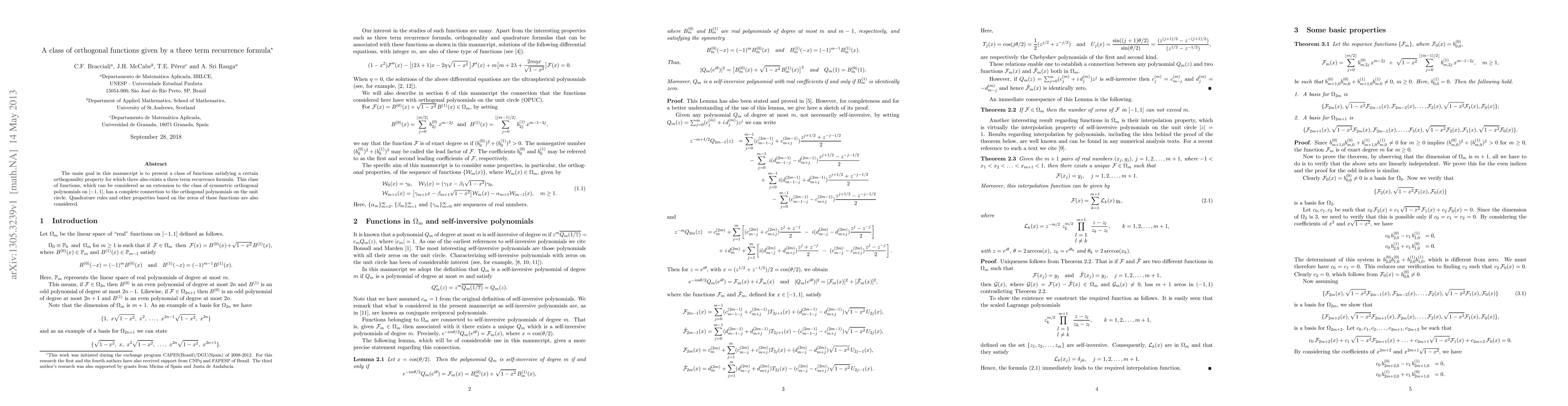 The main goal in this manuscript is to present a class of functions satisfying a certain orthogonality property for which there also exists a three term recurrence formula. This class of functions, which can be considered as an extension to the class of symmetric orthogonal polynomials on $[-1,1]$, has a complete connection to the orthogonal polynomials on the unit circle. Quadrature rules and other properties based on the zeros of these functions are also considered.