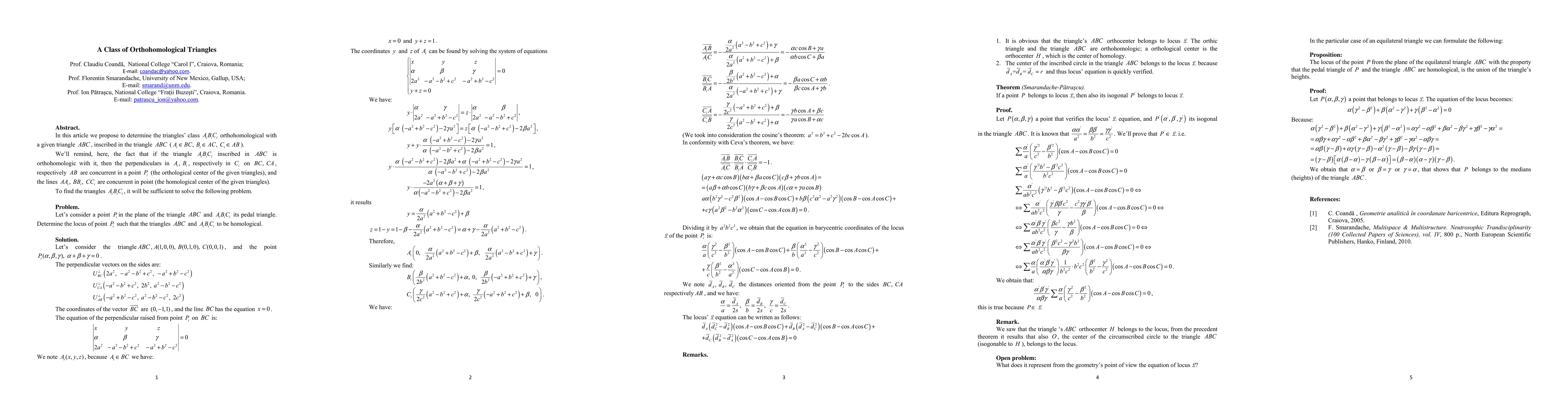 In this article we determine the class of triangles $A_iB_iC_i$ which are orthohomological with a given triangle $ABC$ and inscribed in the triangle $ABC$ (with $A_i \in BC$, $B_i \in CA$ and $C_i \in AB$).