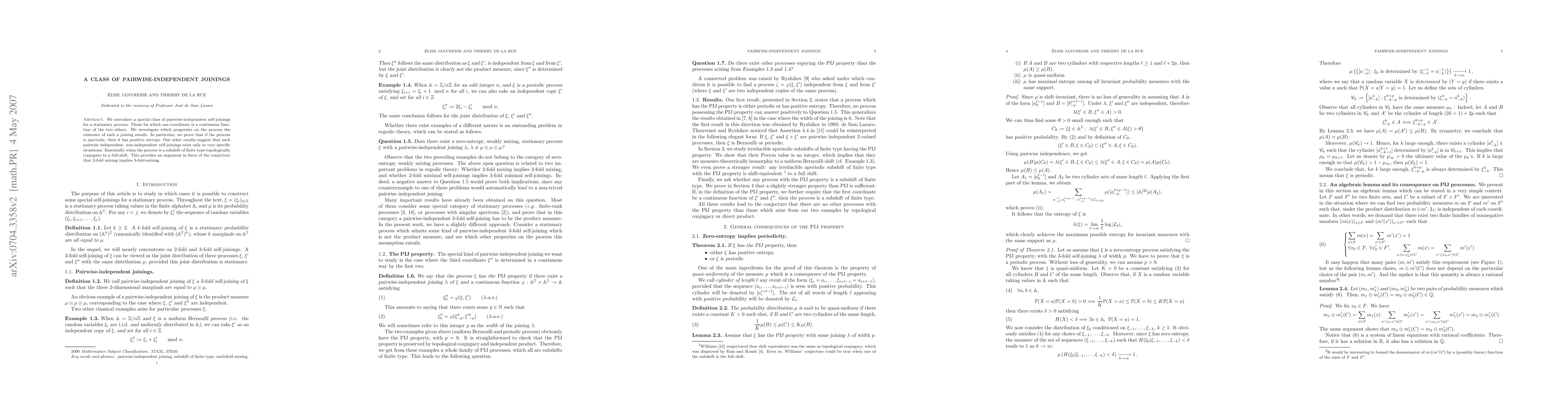 This paper introduces a class of pairwise-independent self-joinings for stationary processes, where one coordinate is a continuous function of the other two. It demonstrates that aperiodic processes with such joinings have positive entropy, and suggests that such joinings occur mainly when the process is a subshift of finite type.