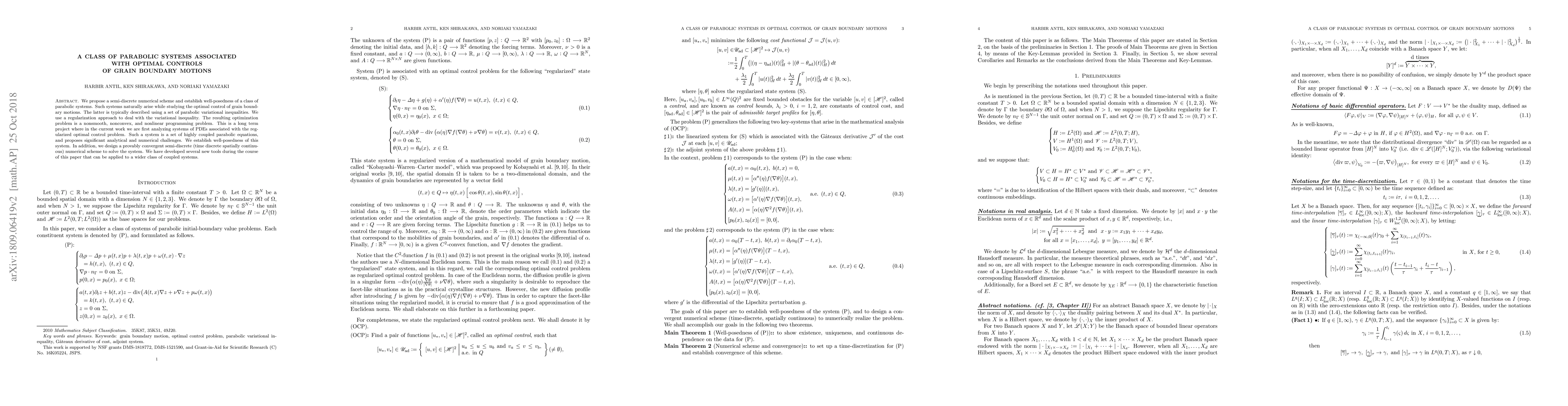 We propose a semi-discrete numerical scheme and establish well-posedness of a class of parabolic systems. Such systems naturally arise while studying the optimal control of grain boundary motions. The latter is typically described using a set of parabolic variational inequalities. We use a regularization approach to deal with the variational inequality. The resulting optimization problem is a nonsmooth, nonconvex, and nonlinear programming problem. This is a long term project where in the current work we are first analyzing systems of PDEs associated with the regularized optimal control problem. Such a system is a set of highly coupled parabolic equations, and proposes significant analytical and numerical challenges. We establish well-posedness of this system. In addition, we design a provably convergent semi-discrete (time discrete spatially continuous) numerical scheme to solve the system. We have developed several new tools during the course of this paper that can be applied to a wider class of coupled systems.