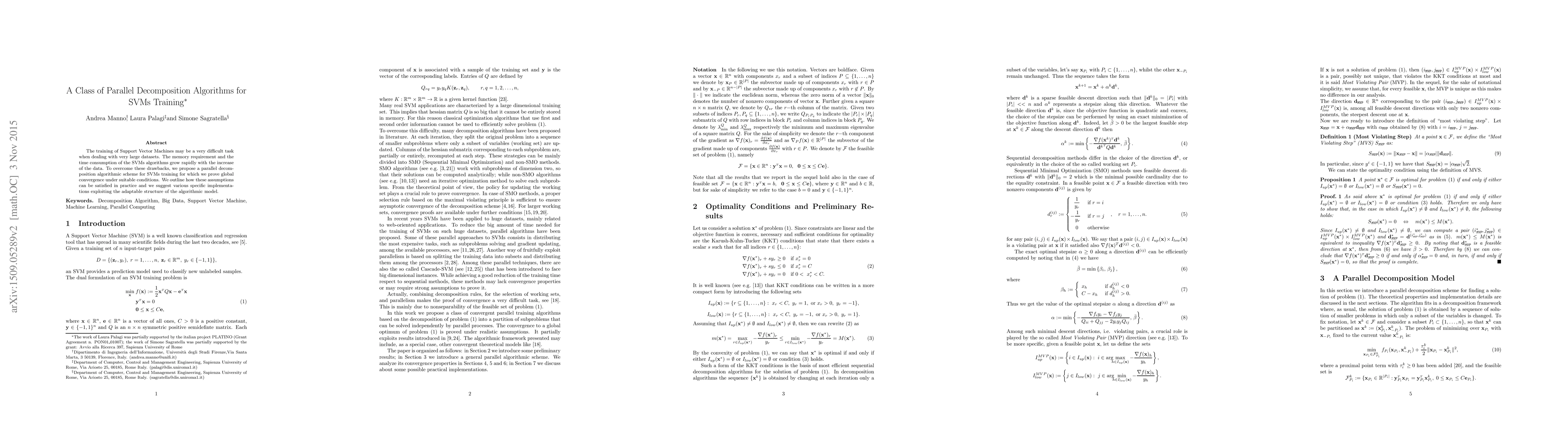 This paper proposes a parallel decomposition algorithm to efficiently train Support Vector Machines (SVMs) on large datasets, addressing the challenges of memory and time consumption. The authors prove global convergence under suitable conditions and suggest practical implementations leveraging the algorithm's adaptable structure.