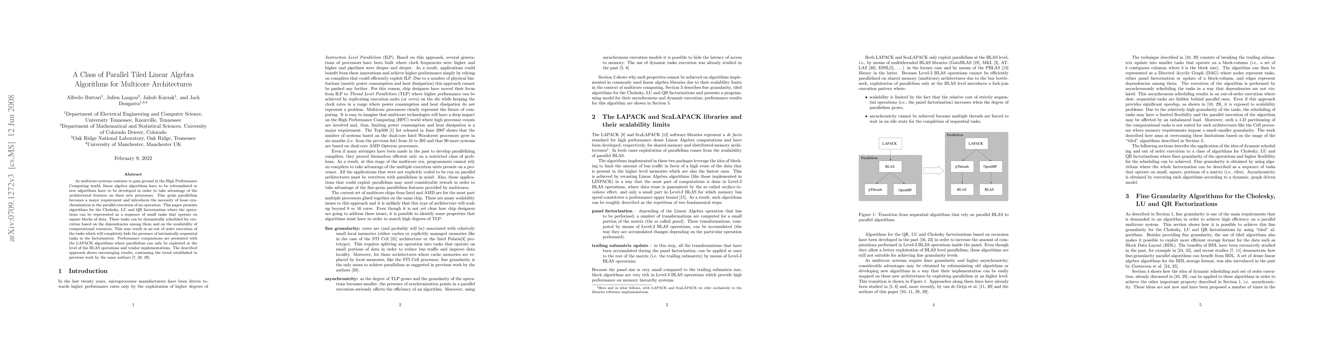 This paper introduces parallel tiled linear algebra algorithms for multicore systems, focusing on Cholesky, LU, and QR factorizations. The algorithms break operations into small tasks that can be dynamically scheduled to exploit fine-grain parallelism and minimize synchronization overhead, achieving better performance compared to traditional LAPACK implementations.